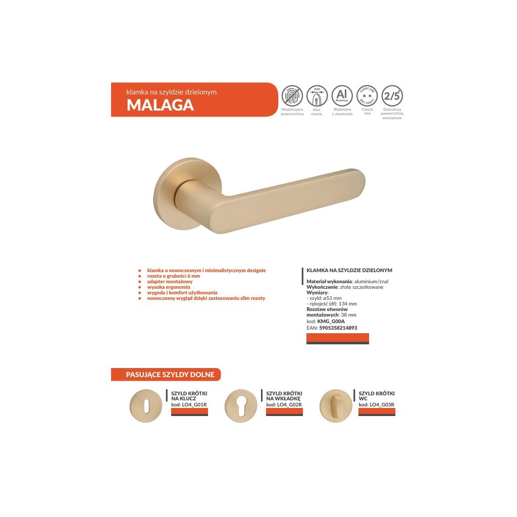 Rukoväť Malaga v povrchovej úprave z brúseného zlata je synonymom elegancie a modernosti, dokonalým doplnkom každého sofistikovaného interiéru. Jeho ergonomický dizajn poskytuje nielen pohodlie, ale aj komfort používania na najvyššej úrovni. Vďaka použitiu tenkej rozety vyzerá rukoväť mimoriadne moderne a dodáva miestnosti jemný, ale výrazný štýlový akcent. Povrchová úprava z brúseného zlata dodáva rukoväti nielen exkluzívny nádych, ale na dotyk pôsobí aj dojmom mäkkosti, čo umocňuje pocit pohodlia pri každodennom používaní. Rukoväť Malaga je nielen funkčným zariadením, ale aj výraznou dekoráciou, ktorá podčiarkuje moderný charakter interiéru. Vďaka svojmu jedinečnému dizajnu a povrchovej úprave získava každá miestnosť eleganciu a sofistikovanosť.