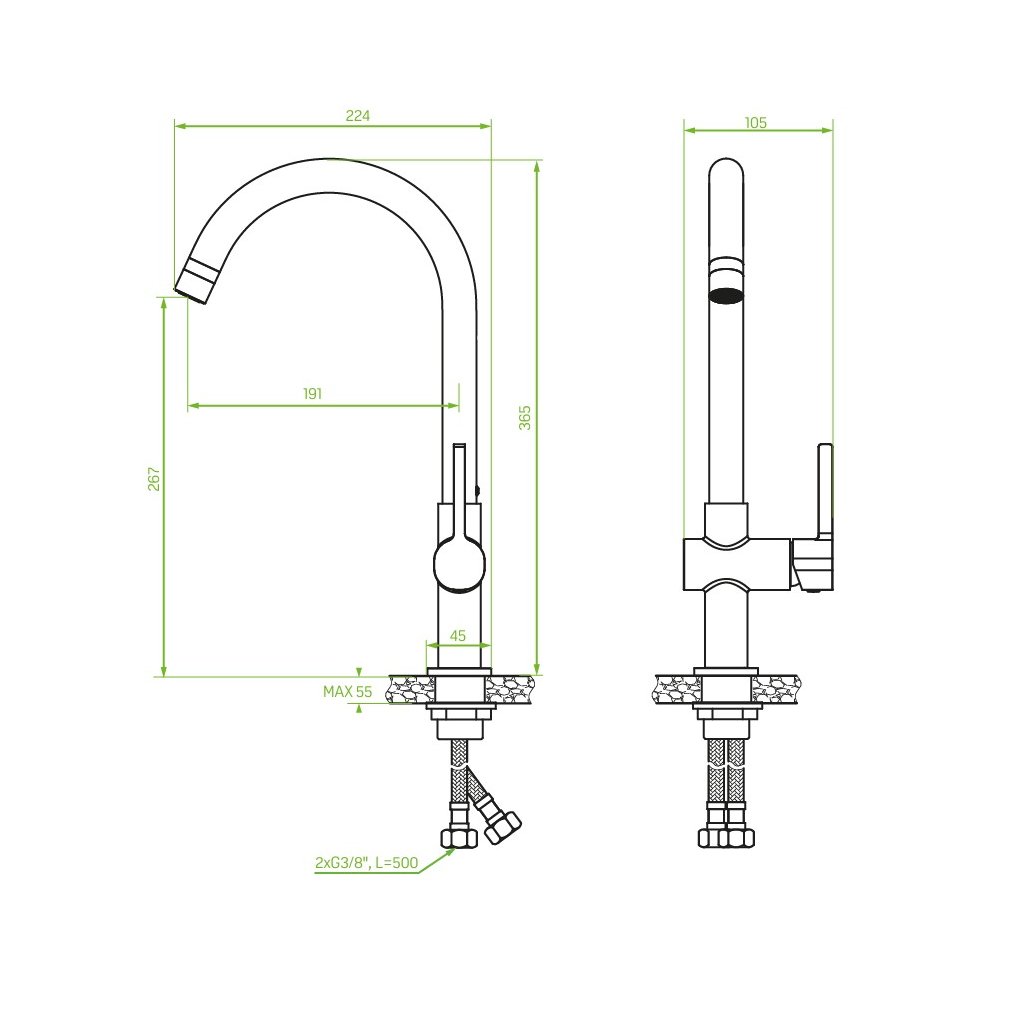 Táto stojanková drezová batéria z kolekcie „Alita“ je určená pre moderné kuchyne, kde je dôležitá funkčnosť aj dizajn. Vysoký oblúkový výtok v tvare „U“ poskytuje dostatok priestoru na pohodlné plnenie vysokých nádob či manipuláciu s väčším riadom. Batéria má jednopákové ovládanie a keramickú kartušu s priemerom 25 mm, čo zaručuje spoľahlivý a hladký chod. Trieda prietoku ECO (≤ 9 l/min) pomáha znižovať spotrebu vody bez obmedzenia komfortu. Oceľová povrchová úprava dodáva kuchyni výrazný moderný vzhľad.