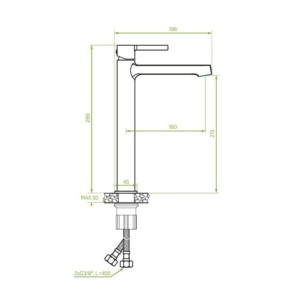 Táto vysoká stojanková batéria z kolekcie „Alita“ je ideálnym riešením pre umývadlá na doske alebo vyššie keramické misy. Moderný dizajn dopĺňa chrómová povrchová úprava, ktorá dodáva kúpeľni elegantný a prémiový vzhľad. Batéria je vybavená jednopákovým ovládaním a kvalitnou keramickou kartušou s priemerom 25 mm, vďaka čomu ponúka hladké, presné a spoľahlivé ovládanie. Výška batérie približne 299 mm a dosah výtoku okolo 160 mm zabezpečujú komfortné používanie aj pri väčších umývadlách. Funkcia ECO s prietokovou triedou Z ≤ 9 l/min znižuje spotrebu vody bez zníženia užívateľského komfortu.