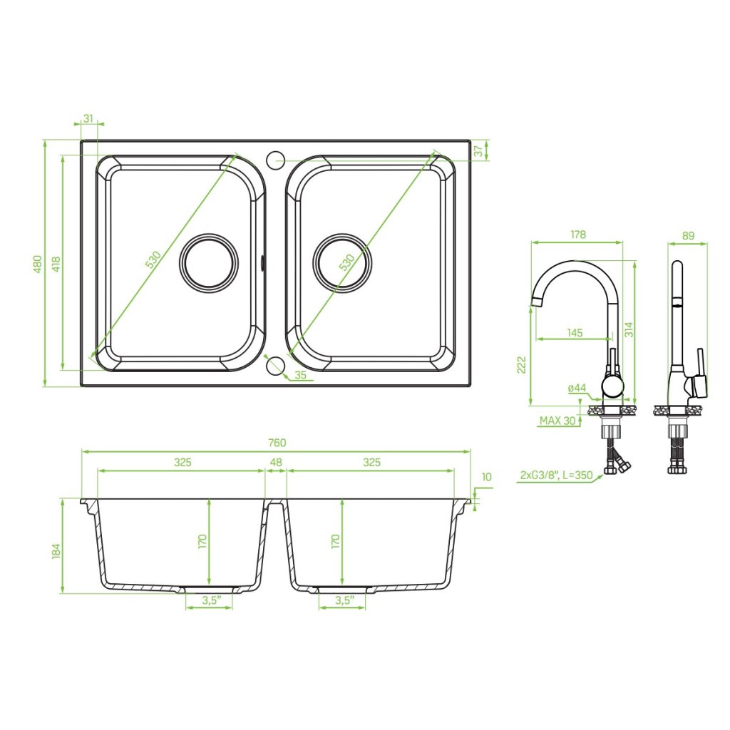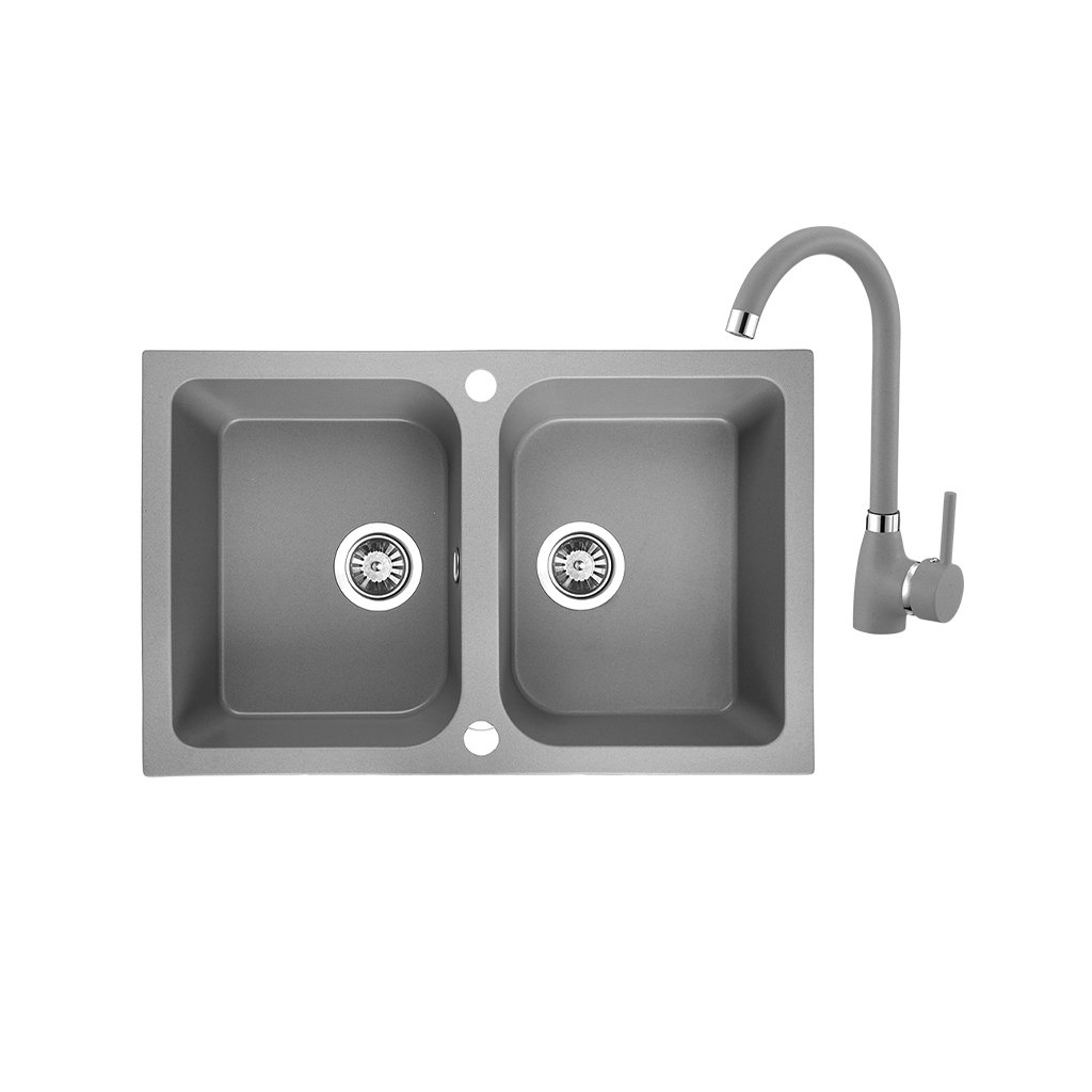 Laveo Celia, 2-komorový granitový drez 760x480x184 mm + drezová batéria s výlevkou v tvare U, šedá, LAV-SBCE520T