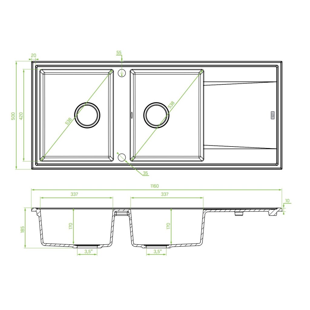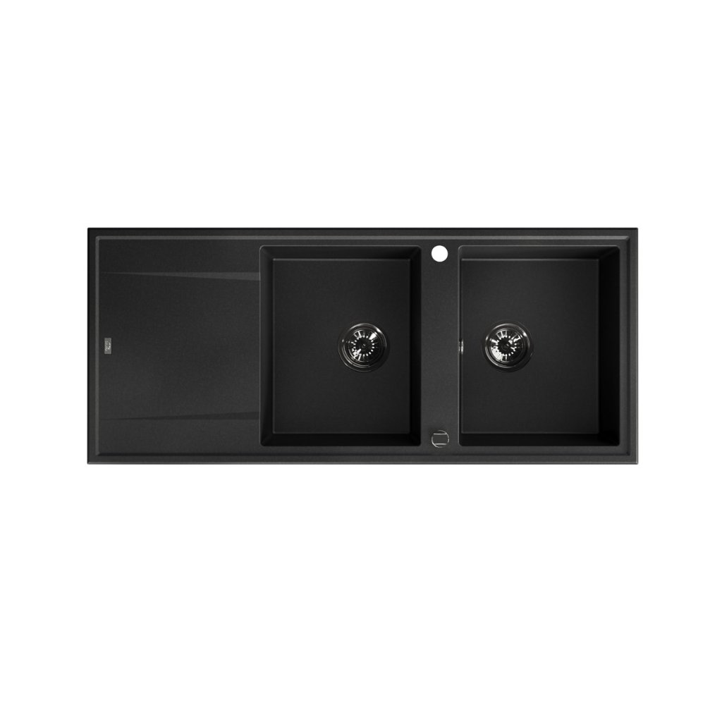 Laveo Megalo, 2-komorový granitový drez 1160x500x185 mm s dlhým odkvapávačom, čierna, LAV-SBE_721B