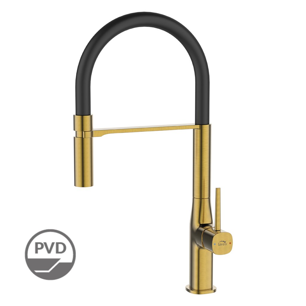 Elegantná zlatá brúsená povrchová úprava dodáva kuchyni luxusný nádych a zároveň jemným spôsobom kontrastuje s čiernou, čo dodáva interiéru moderný a štýlový nádych. Batéria Pola plní nielen svoje základné funkcie, ale je aj efektívnym dekoratívnym prvkom, ktorý obohatí vzhľad každej kuchyne a zlepší jej estetiku a funkčnosť.