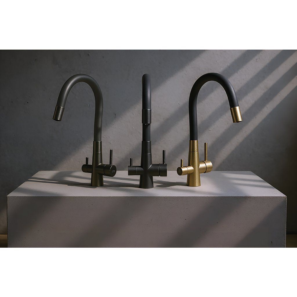 Kombinácia brúseného zlata a čiernej matnej povrchovej úpravy robí z batérie výrazný dizajnový prvok — hodí sa k drezu Laveo Malawi zlatá aj k čiernym granitovým drezom série Muna ako vizuálne sjednocujúci prvok kuchyne.