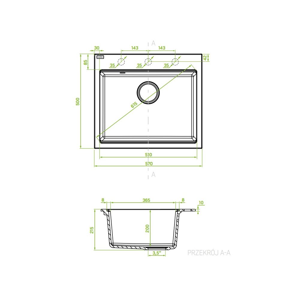 - Kuchynský drez má 3 predvŕtané otvory, pripravené na samovybíjanie (možnosť osadenia batérie, dávkovača saponátu, automatického ovládania odtokovej zátky)