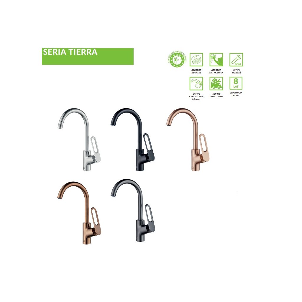 Drezová batéria Tierra je ideálnym návrhom pre tých, ktorí si cenia estetiku rovnako ako funkčnosť. Povrchová úprava z ružového zlata v kombinácii so štíhlym výtokom v tvare U ho robí vhodným pre moderné kuchyne zariadené v štýle glamour. Prevzdušňovač Neoperl so systémom proti vodnému kameňu umožňuje znížiť spotrebu vody (prevzdušňovač zvyšuje objem prúdu) a uľahčuje čistenie vápencových usadenín zanechaných tvrdou vodou. Páka s otvorom pre jednoduchú obsluhu kohútika mokrými alebo špinavými rukami, vďaka dizajnu joysticku, zaručuje plynulé nastavenie prúdu.