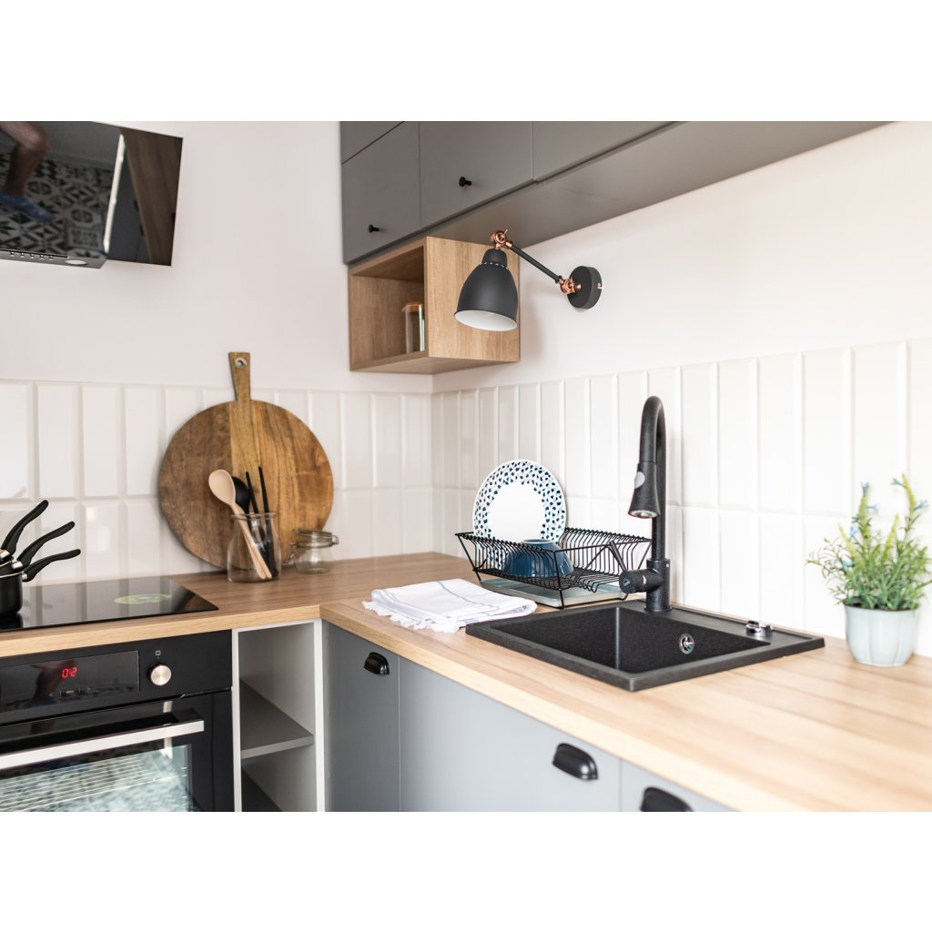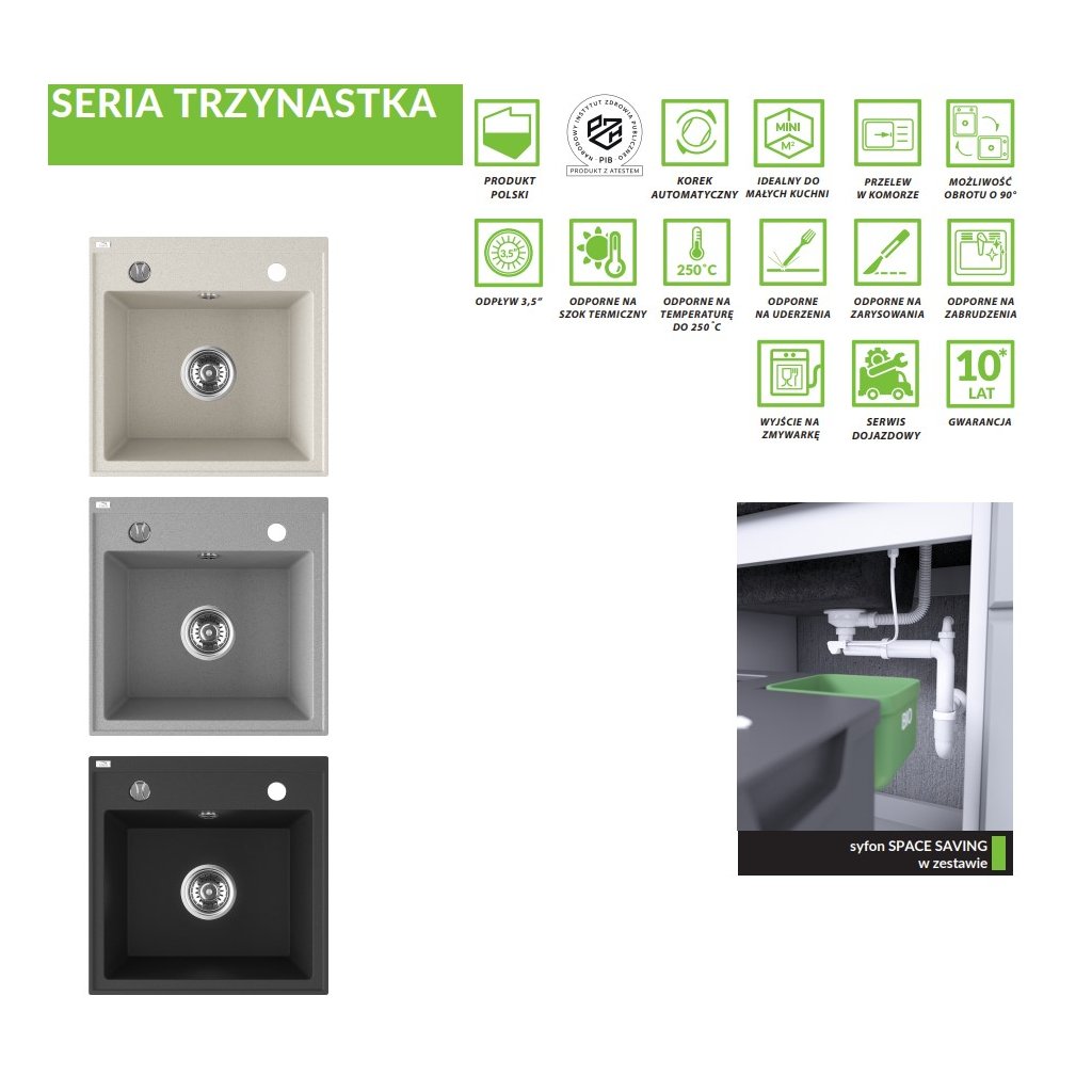 Kuchynský drez Trzynastka je moderným riešením pre elegantné domy a byty. Krásna línia a univerzálne farby v ponuke nepochybne upútajú pozornosť. Kuchynský drez bude vďaka svojmu minimalistickému dizajnu večne mladým produktom, ktorý sa nebojí neustále sa meniacich trendov v zariaďovaní interiéru. V ponuke sú tri modely, každý je dostupný v troch povrchových úpravách, t.j. v béžovej, šedej a čiernej. Prvým z nich je 1-komorový drez v kompaktnom rozmere 44x44 cm, no s hlbokou misou - 17 cm - ideálne riešenie do malých kuchýň v bytoch. Druhým je 1-komorový drez s odkvapkávačom v štandardnom rozmere 79x48 cm - odkvapkávač sa bude hodiť ako predĺženie pracovnej dosky. V ponuke je aj 1-komorový drez s polovičným odkvapkávačom. Tento kompaktný model sa bude hodiť do malých kuchýň. Drez je dodávaný so sifónom na úsporu miesta, ktorý umožňuje pohodlnú organizáciu priestoru v skrinke pod ním, aby sa tam zmestili napr. koše na separáciu odpadu. Pri výrobe bola použitá žula, ktorá zaručuje odolnosť proti zafarbeniu, škrabancom, nárazom, teplotným šokom a teplote do 250ºC. Výrobca poskytuje na výrobok dlhú 10-ročnú záruku.