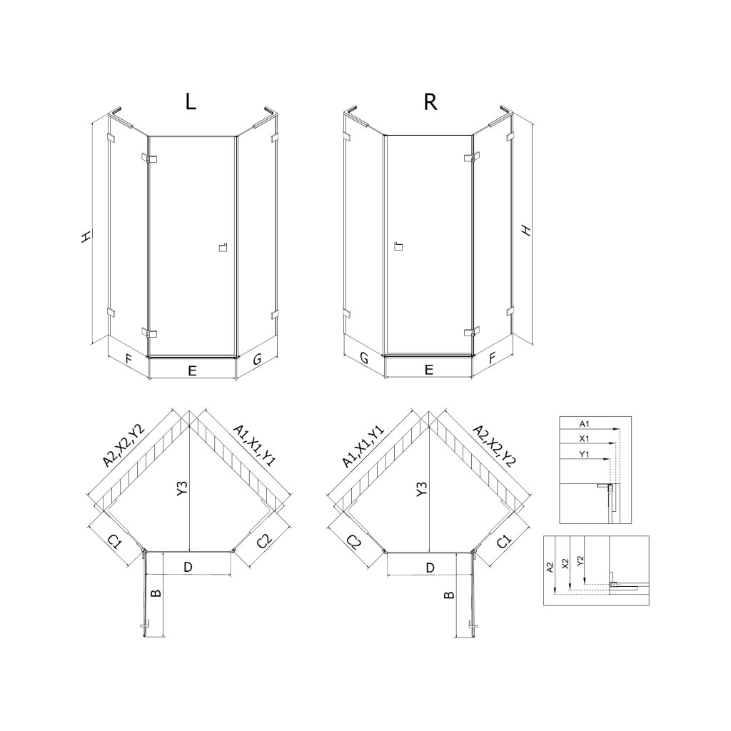 Mexen Lunar, L päťuholníkový sprchový kút naklápací doľava 90 x 100 cm, 8mm číre sklo, oceľový profil, 831L-090L-100P-97-00-L