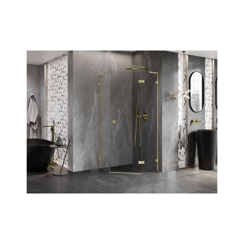 Mexen Lunar, L päťuholníkový sprchový kút s pravým sklonom 90 x 90 cm, 8mm číre sklo, zlatý matný profil, 831L-090P-090L-55-00-P