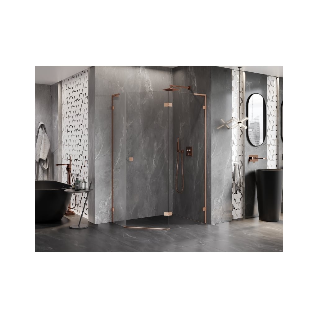 Mexen Lunar, L pravý výklopný päťuholníkový sprchový kút 100 x 90 cm, 8mm číre sklo, profil medená matná, 831L-100P-090L-65-00-P
