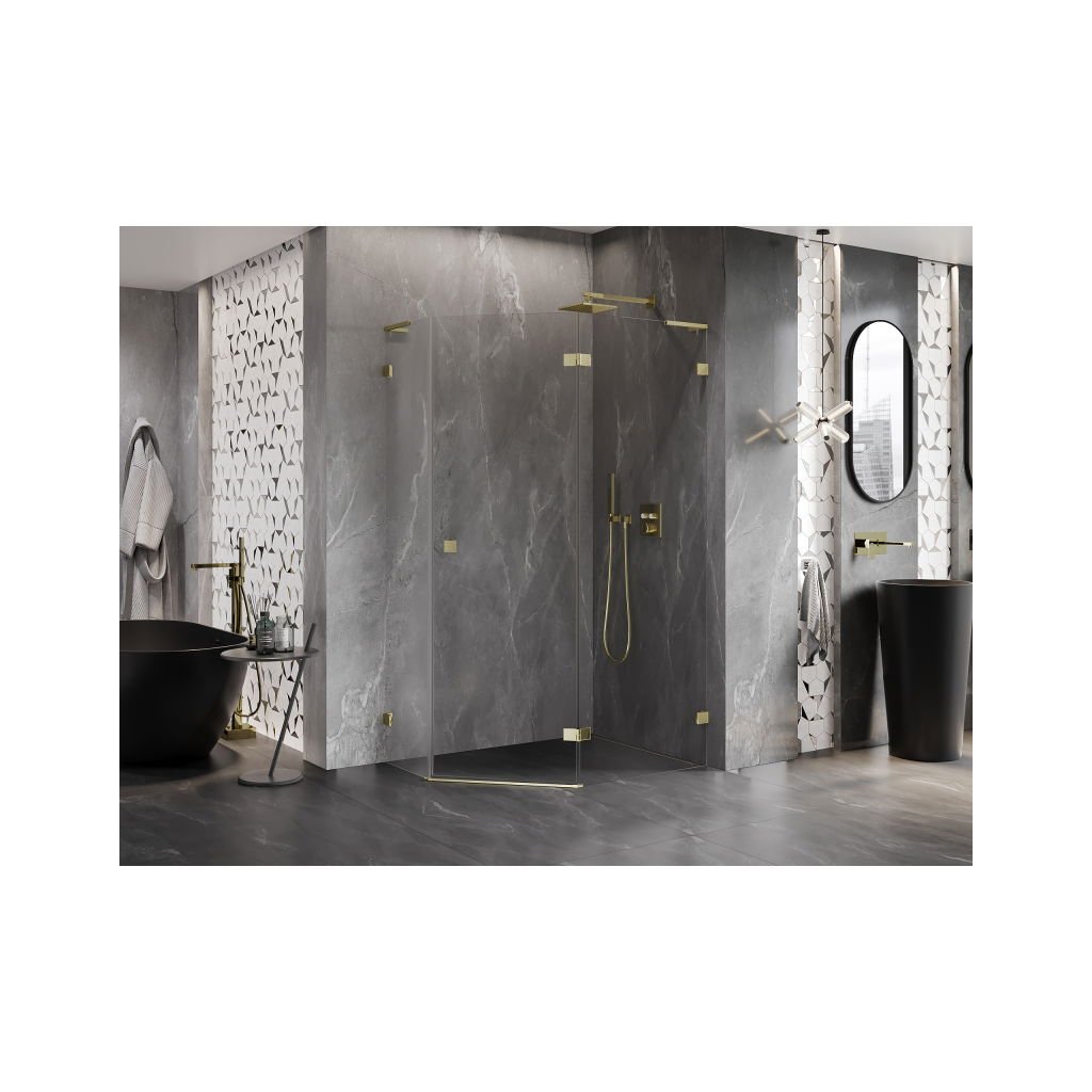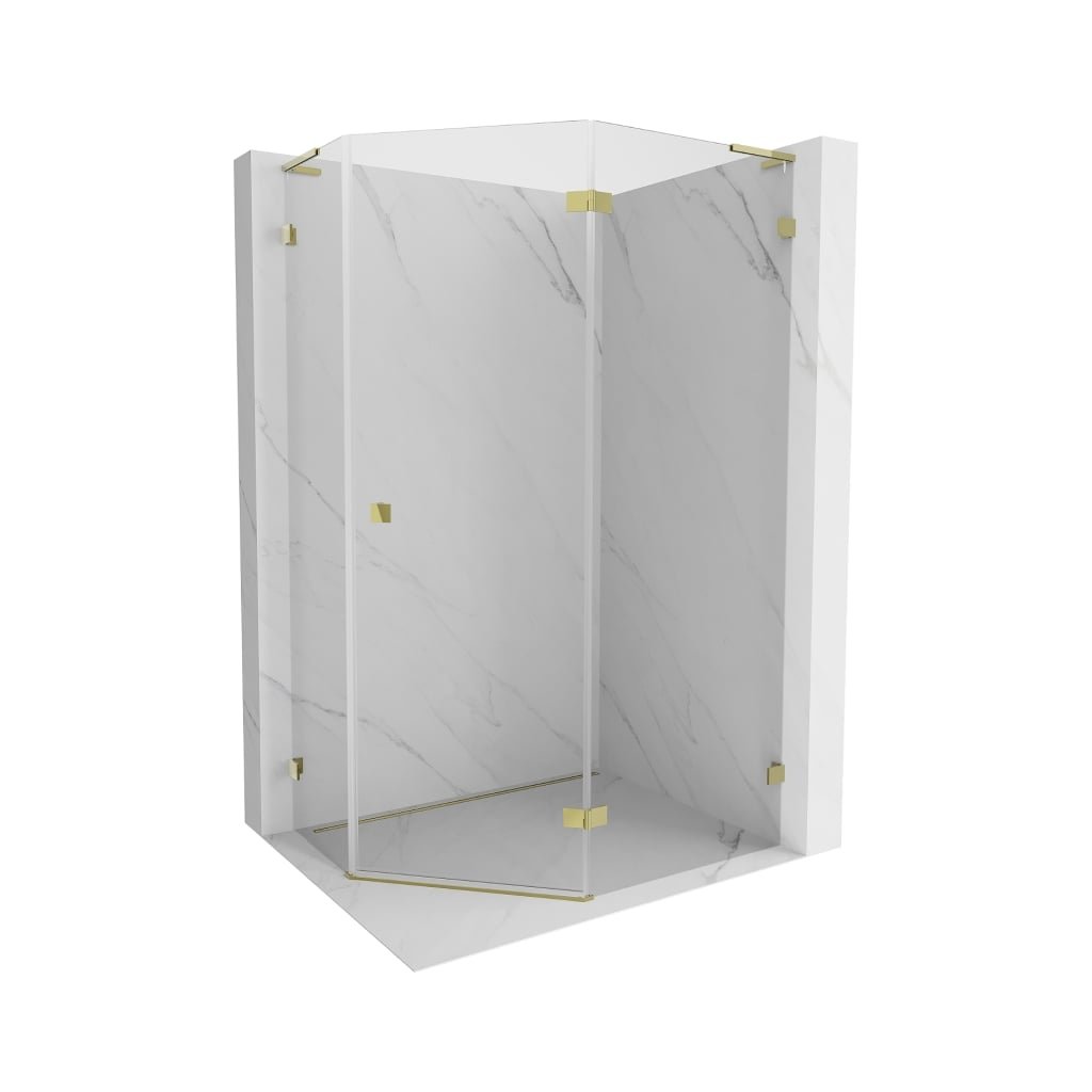 Mexen Lunar, L pravý výklopný päťuholníkový sprchový kút 100 x 90 cm, 8mm číre sklo, zlatý profil, 831L-100P-090L-50-00-P