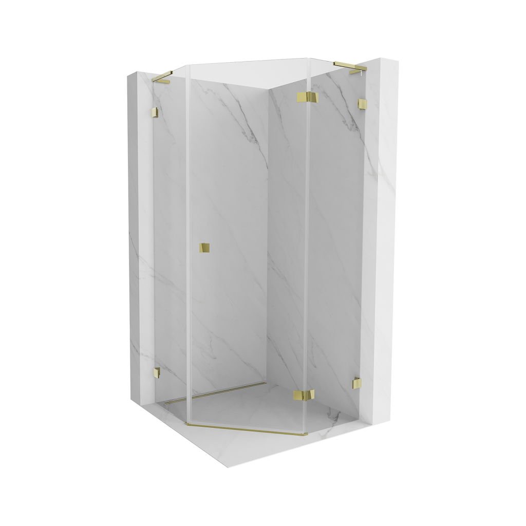 Mexen Lunar, L pravý výklopný päťuholníkový sprchový kút 90 x 90 cm, 8mm číre sklo, zlatý profil, 831L-090P-090L-50-00-P