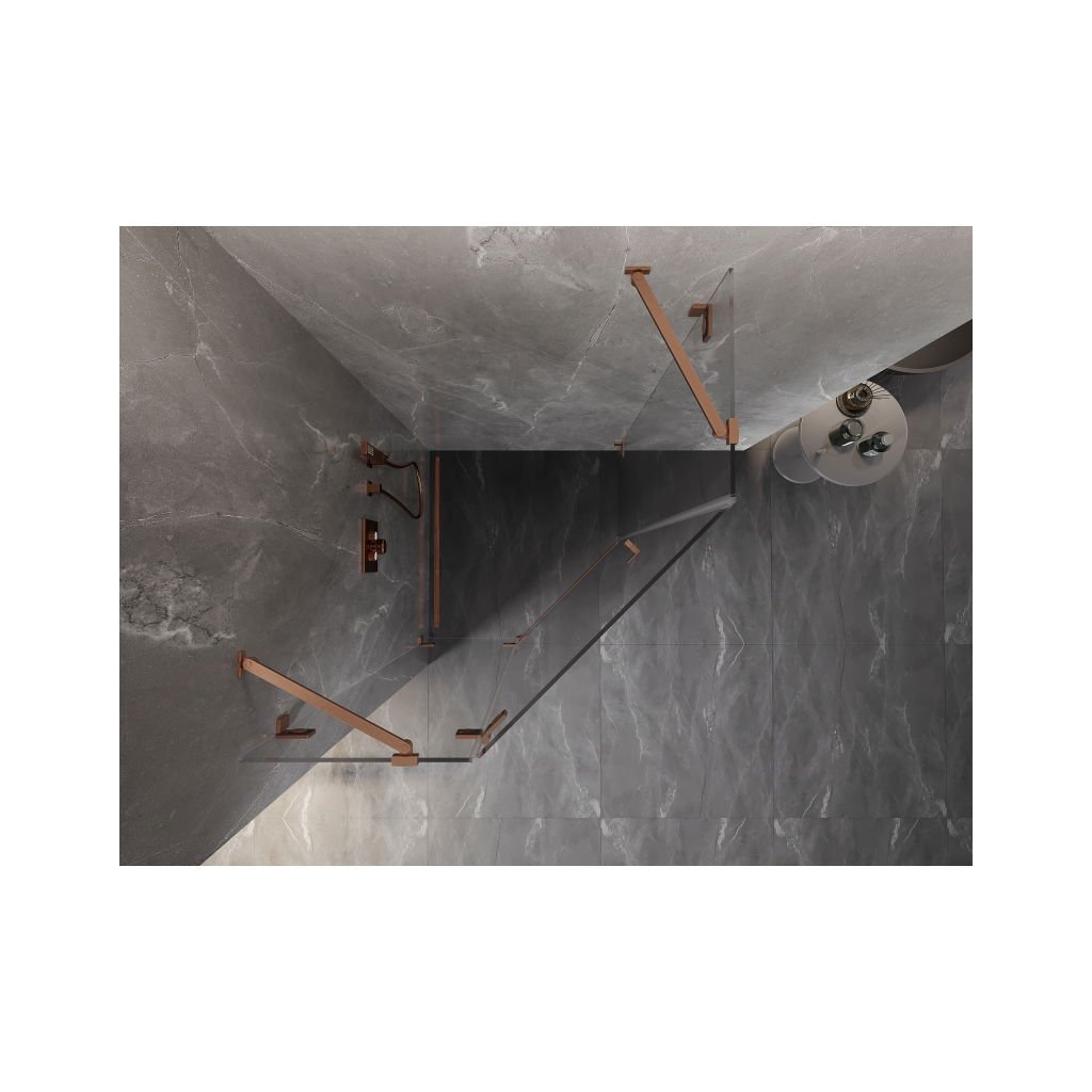 Mexen Lunar, päťuholníkový sprchový kút s ľavým sklonom 80 x 80 cm, 8mm číre sklo, profil medená matná, 831-080L-080P-65-00-L