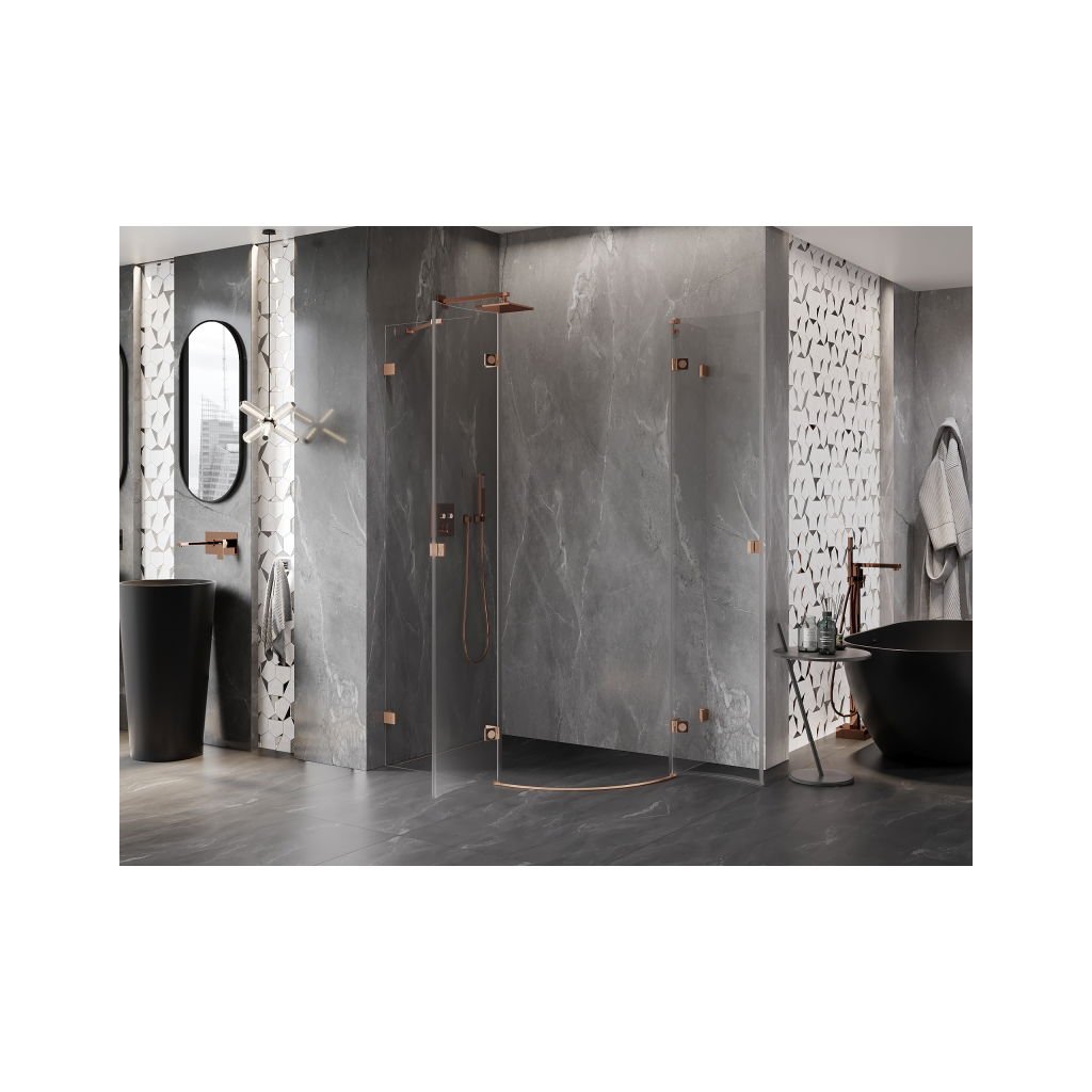 Mexen Lunar, polkruhový sprchový kút naklápací doľava 90 x 70 cm, 8mm číre sklo, profil medená matná, 833-090L-070P-65-00