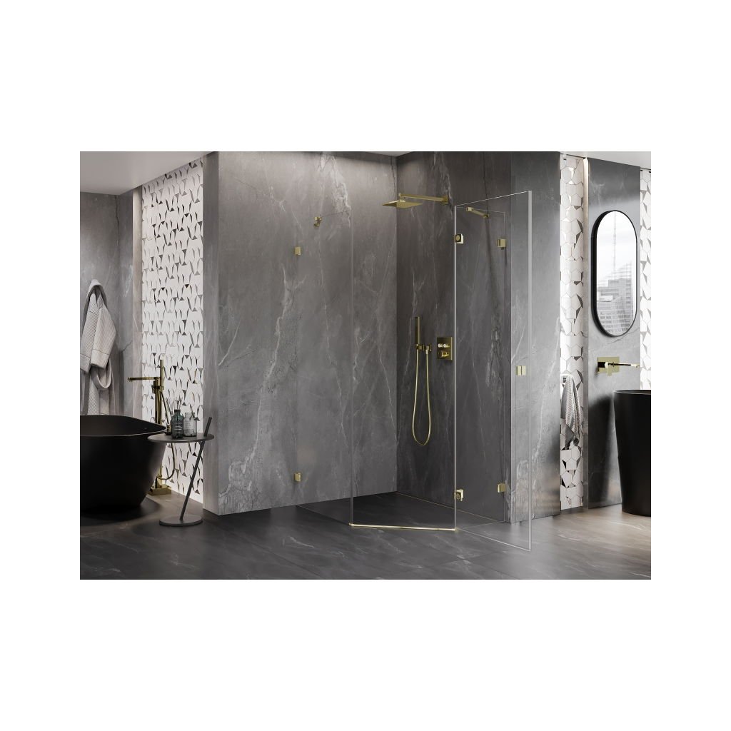 Mexen Lunar, výklopný päťuholníkový sprchový kút pravý 90 x 100 cm, 8mm číre sklo, zlatý profil, 831-090P-100L-50-00-P