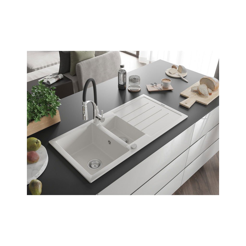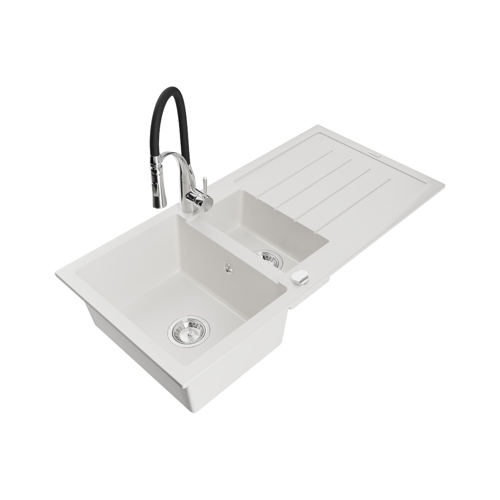 Mexen Andres, 1,5-komorový granitový drez 1000x500x200 mm a drezová batéria Aster, biela, 6515-20-73450-07