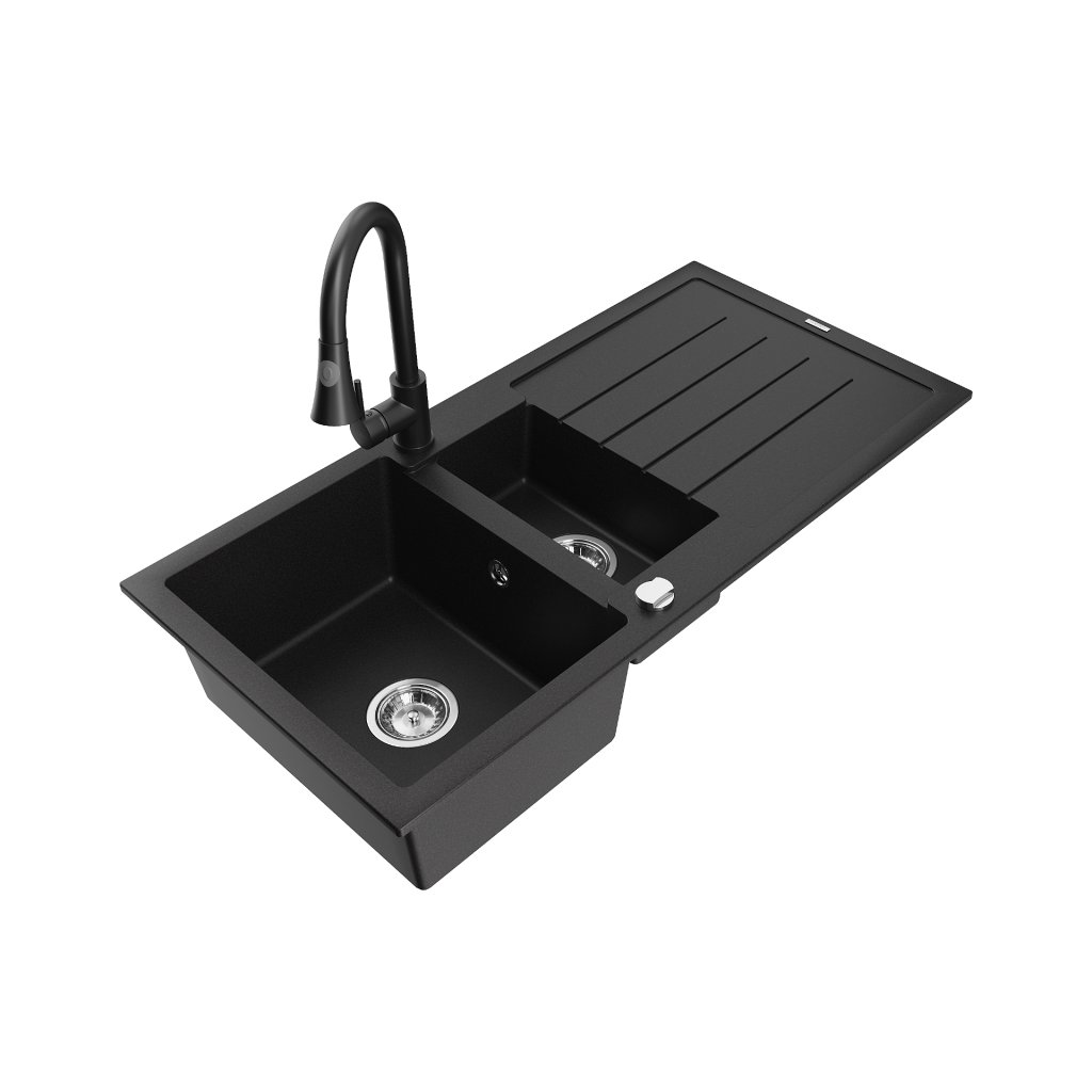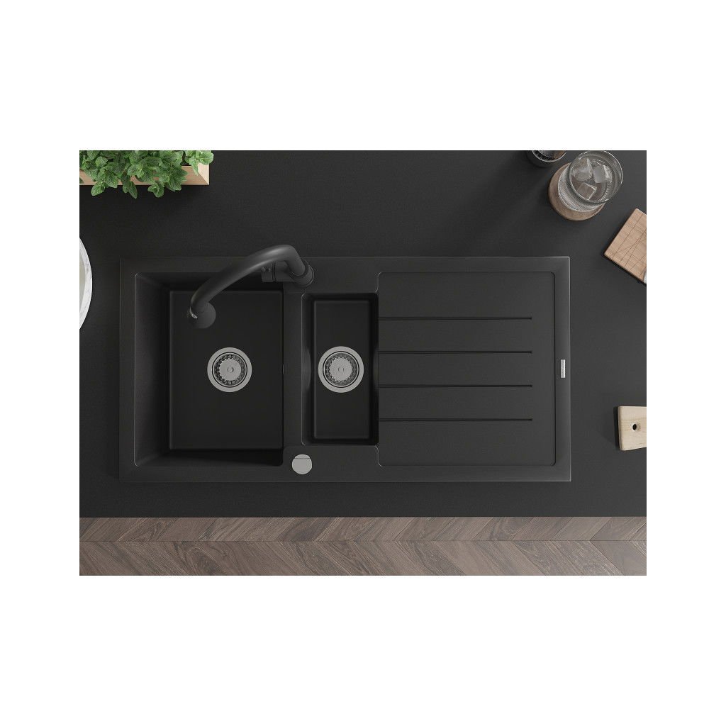 Mexen Andres, 1,5-komorový granitový drez 1000x500x200 mm a drezová batéria Elia, čierna, 6515-77-670101-70