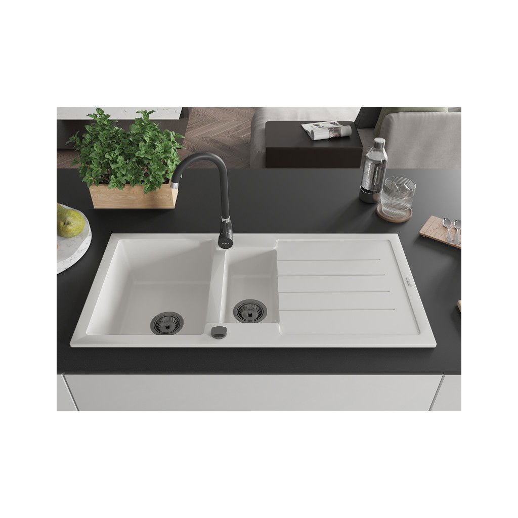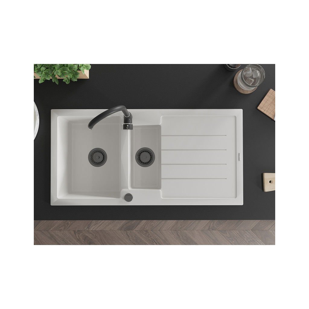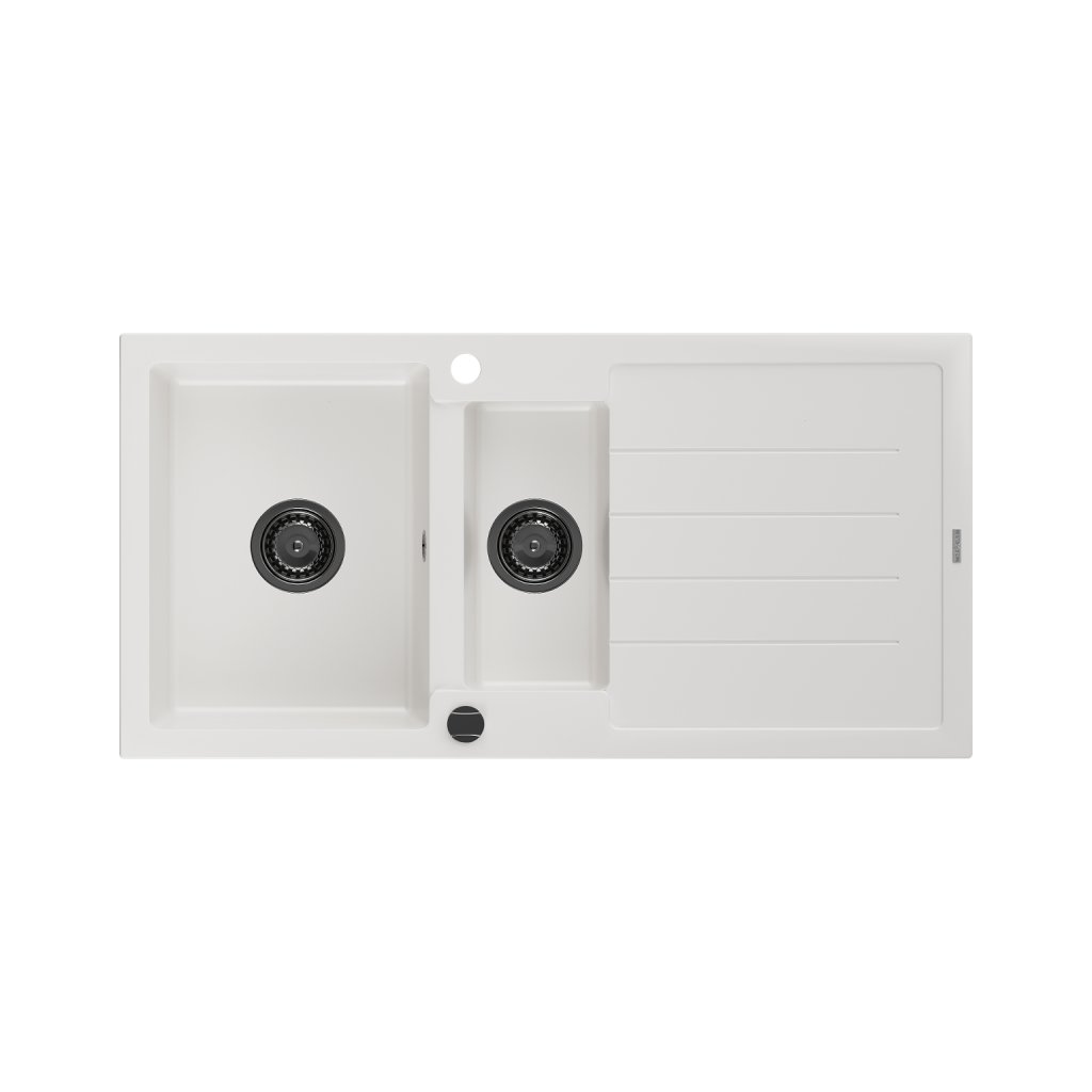 Mexen Andres, granitový drez 1000x500x200 mm, 1,5-komorový, biela s čiernym sifónom, 6515101510-20-B