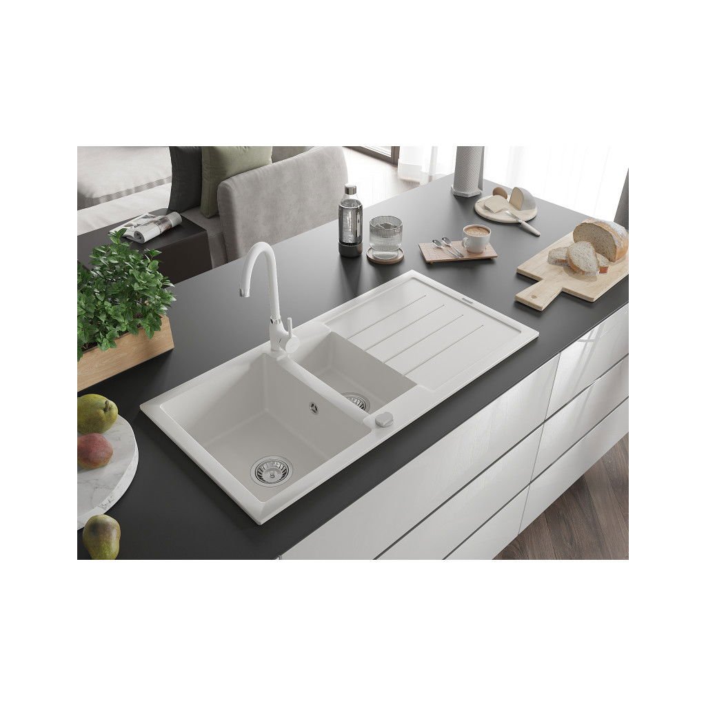 Mexen Andres 1,5-komorový granitový kuchynský drez s odkvapkávačom 100x50 cm a kuchynská batéria Telma, biela, 6515-20-670200-20