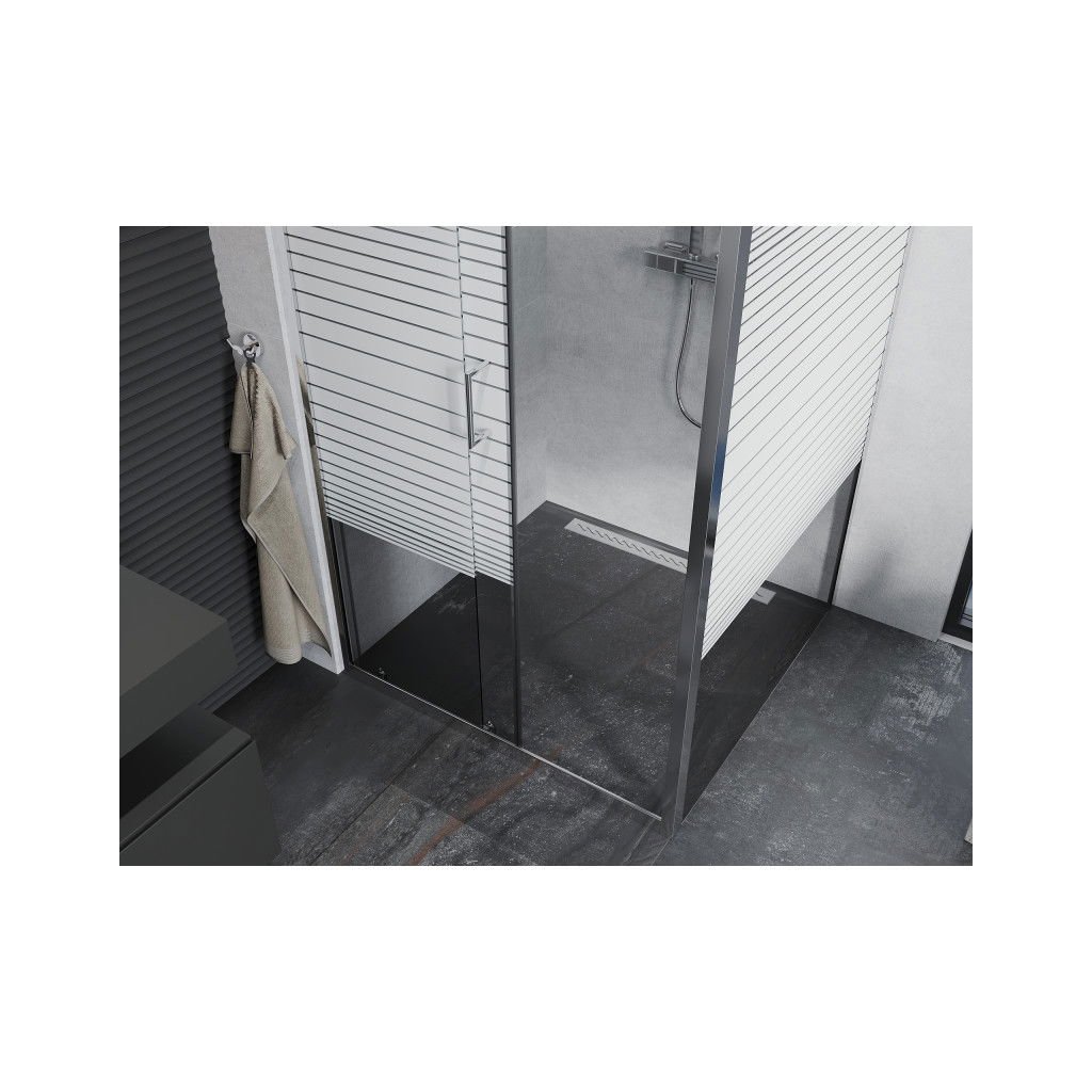 Sprchový kút zo série Mexen Apia je skvelá voľba vyrobená z 5mm tvrdeného skla v čírom prevedení s pásikavým vzorom. Sprchové posuvné dvere obsahujú spoľahlivé dvojité koliečka, ktoré zaručujú hladké a tiché posúvanie. Na otváranie slúži decentná kovová rukoväť. Špeciálny poťah na skle uľahčuje jeho umývanie a umožňuje Vám tak si užiť dokonale priehľadné a lesklé sklo dlhšie. Tvrdené a bezpečné sklo a prvky povrchovej úpravy dverí boli vyrobené z nehrdzavejúceho materiálu potiahnutého vysoko lesklým chrómom. Hliníkový profil s prahom zaručuje dokonalú tesnosť. Inštalácia je možná na sprchovú vaničku alebo dlažbu (sprchová vanička ani odtokový žľab nie sú súčasťou balenia ale môžete si ich zakúpiť v našom obchode). Osadenie sprchového kútu je univerzálne, v ľavom alebo pravom prevedení.