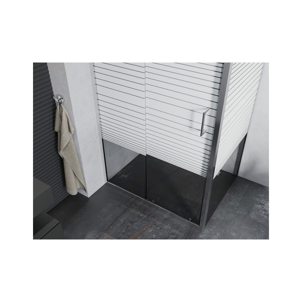 Sprchový kút zo série Mexen Apia je skvelá voľba vyrobená z 5mm tvrdeného skla v čírom prevedení s pásikavým vzorom. Sprchové posuvné dvere obsahujú spoľahlivé dvojité koliečka, ktoré zaručujú hladké a tiché posúvanie. Na otváranie slúži decentná kovová rukoväť. Špeciálny poťah na skle uľahčuje jeho umývanie a umožňuje Vám tak si užiť dokonale priehľadné a lesklé sklo dlhšie. Tvrdené a bezpečné sklo a prvky povrchovej úpravy dverí boli vyrobené z nehrdzavejúceho materiálu potiahnutého vysoko lesklým chrómom. Hliníkový profil s prahom zaručuje dokonalú tesnosť. Inštalácia je možná na sprchovú vaničku alebo dlažbu (sprchová vanička ani odtokový žľab nie sú súčasťou balenia ale môžete si ich zakúpiť v našom obchode). Osadenie sprchového kútu je univerzálne, v ľavom alebo pravom prevedení.