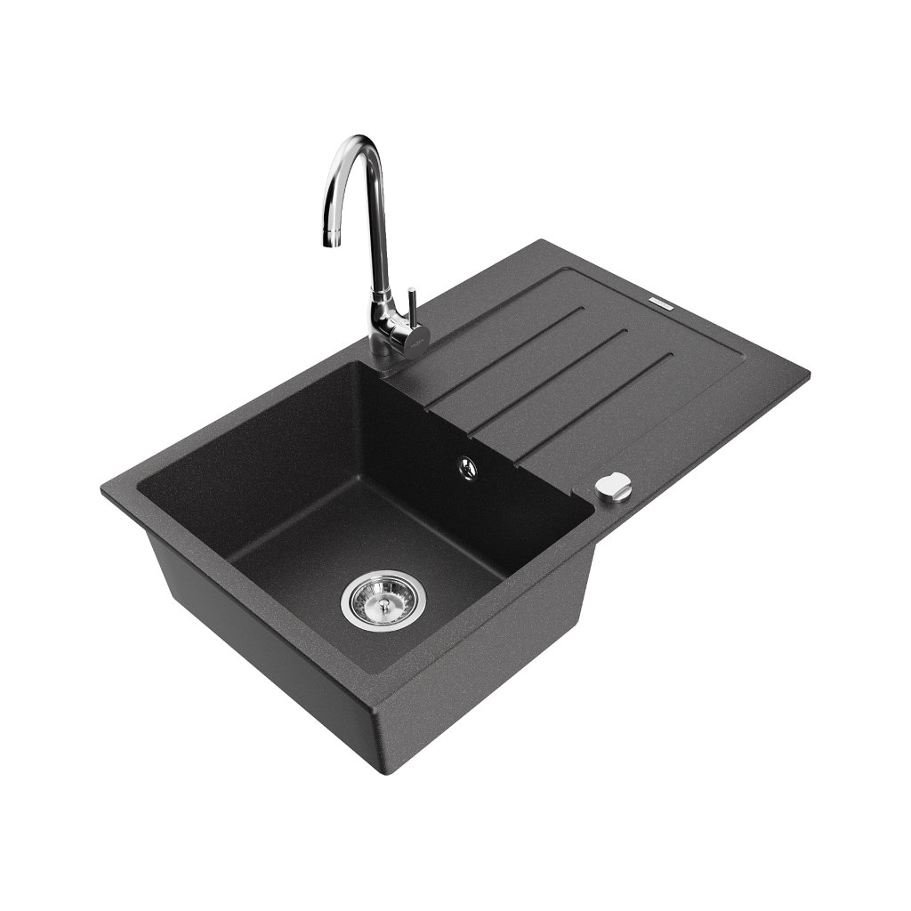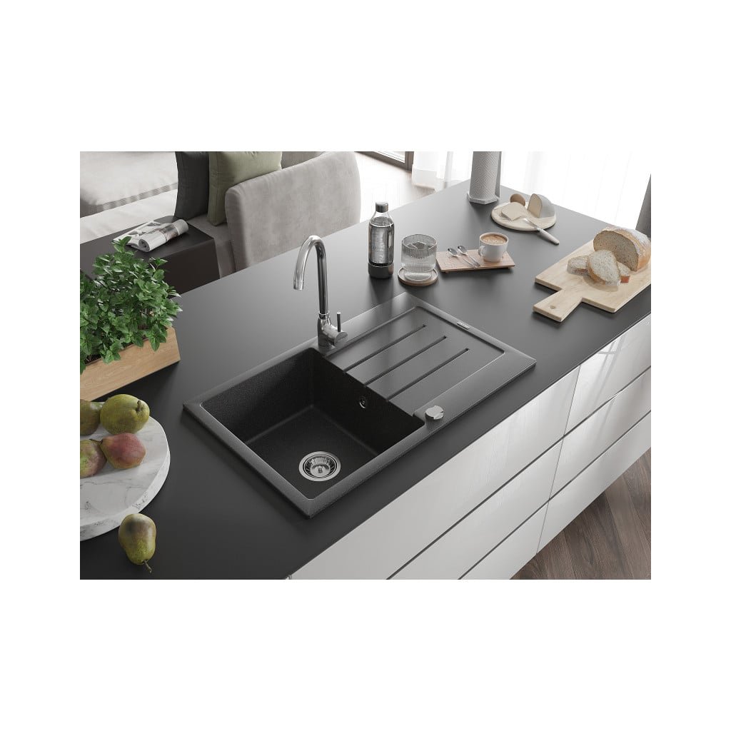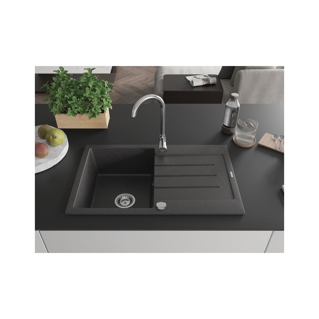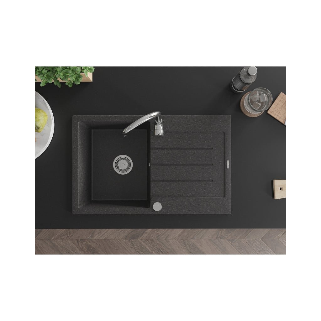 Mexen Bruno, 1-komorový granitový drez s odkvapkávačom 80x50 cm a kuchynskou batériou Telma, čierna-škvrnitá, 6513-76-670200-00