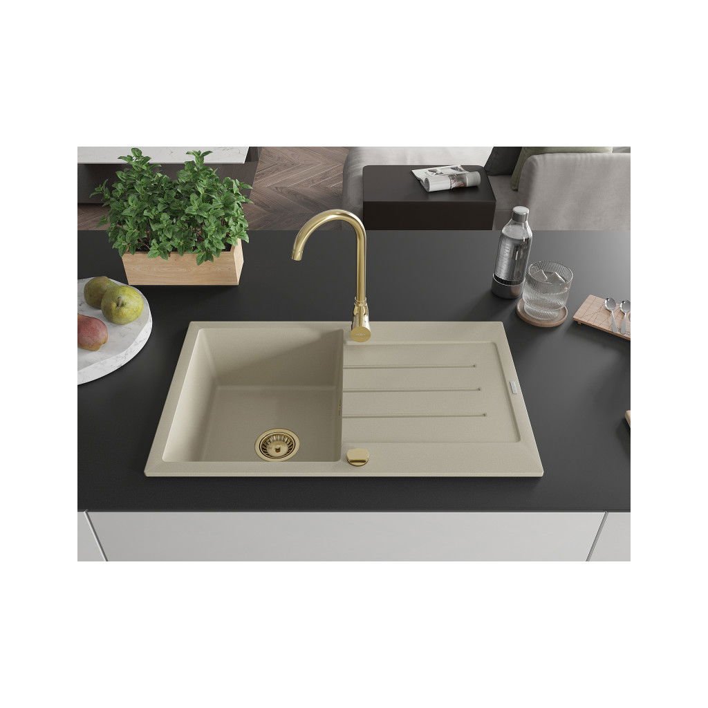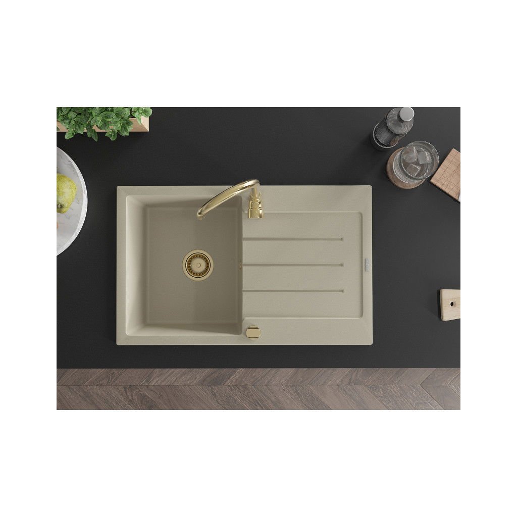 Mexen Bruno, granitový drez 795x495x200 mm, 1-komorový, béžová so zlatým sifónom, 6513791010-69-G