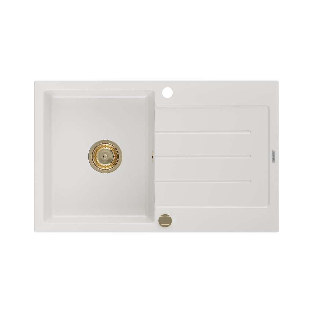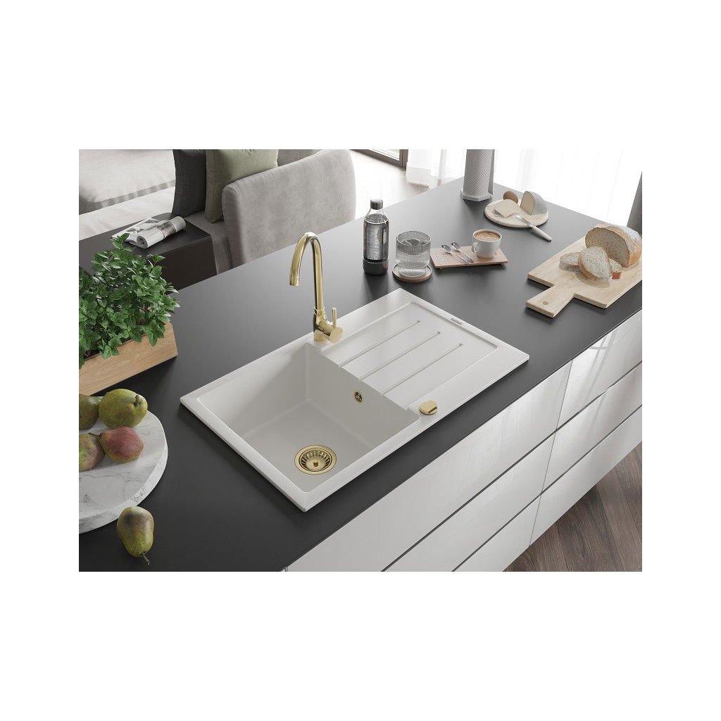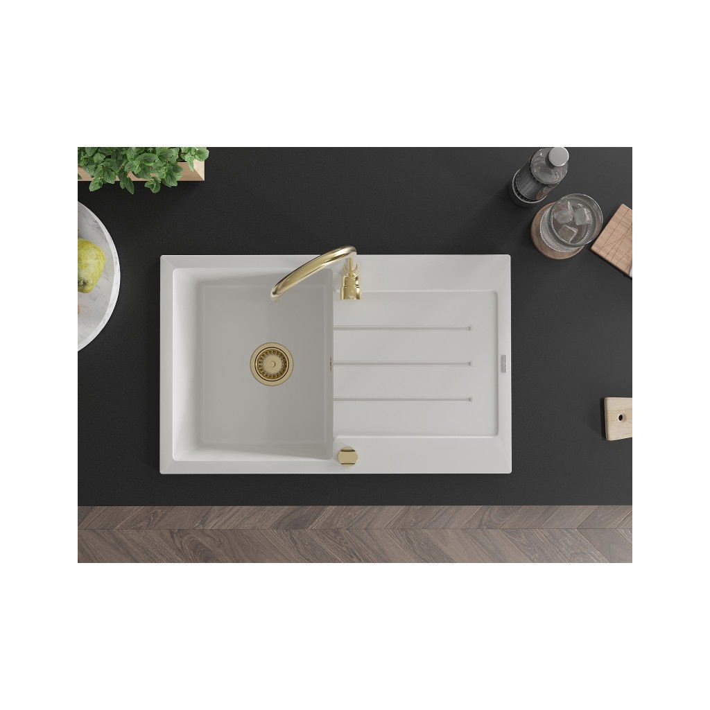 Mexen Bruno, granitový drez 795x495x200 mm, 1-komorový, biela so zlatým sifónom, 6513791010-20-G