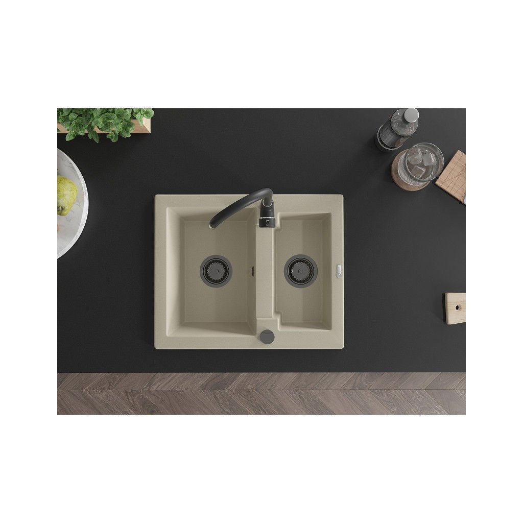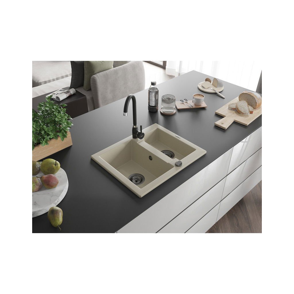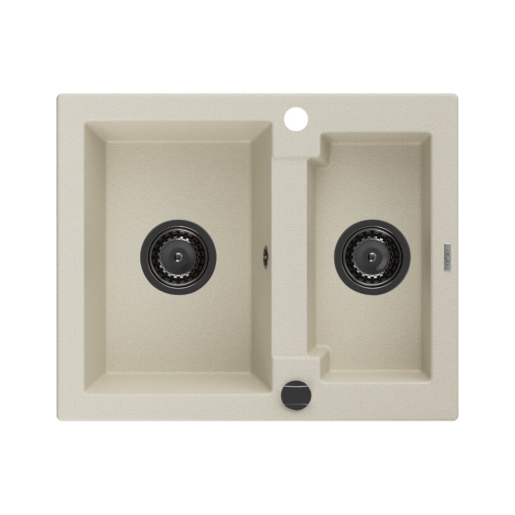 Mexen Carlos, granitový drez 582x475x177 mm, 1,5-komorový, béžová s čiernym sifónom, 6518581500-69-B
