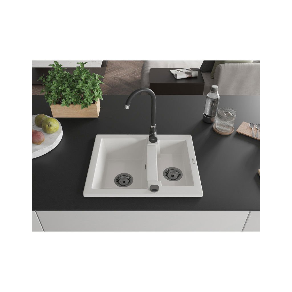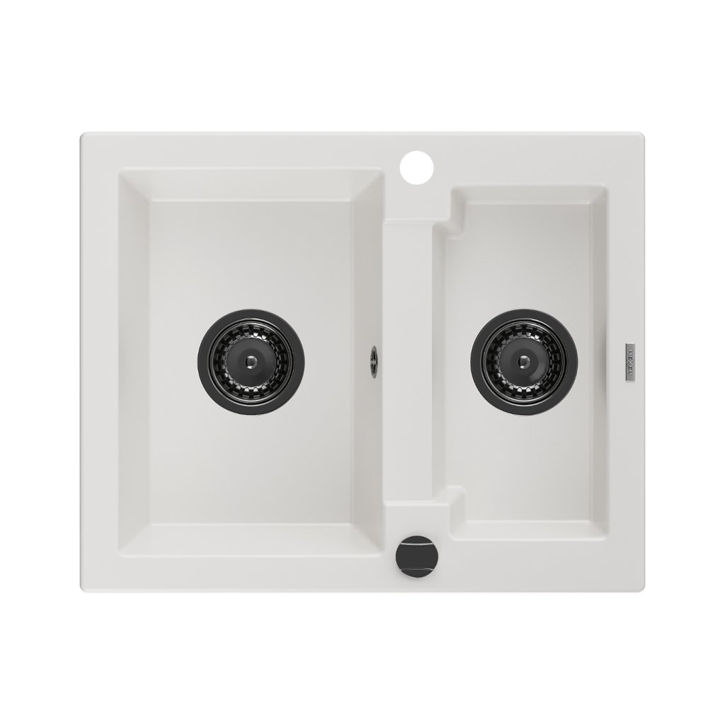 Mexen Carlos, granitový drez 582x475x177 mm, 1,5-komorový, biela s čiernym sifónom, 6518581500-20-B