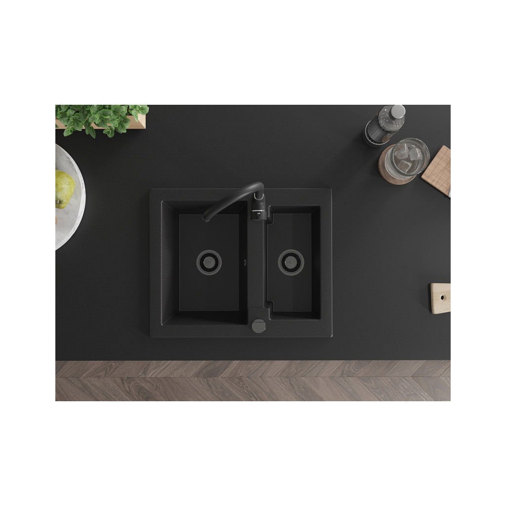 Mexen Carlos, granitový drez 582x475x177 mm, 1,5-komorový, čierna s čiernym sifónom, 6518581500-77-B