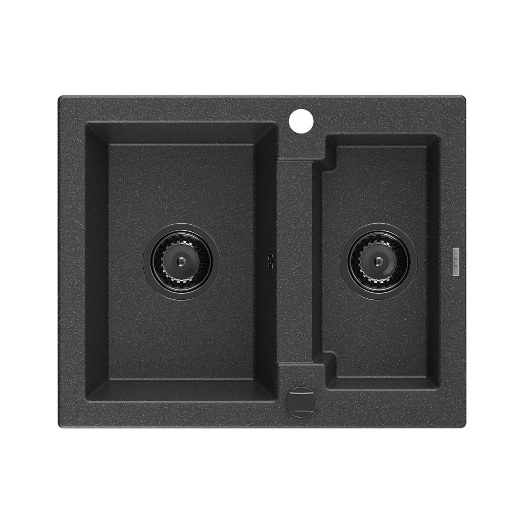 Mexen Carlos, granitový drez 582x475x177 mm, 1,5-komorový, čierna škvrnitá s čiernym sifónom, 6518581500-76-B