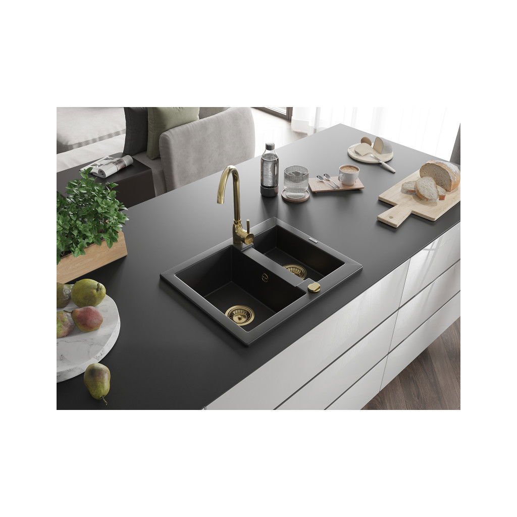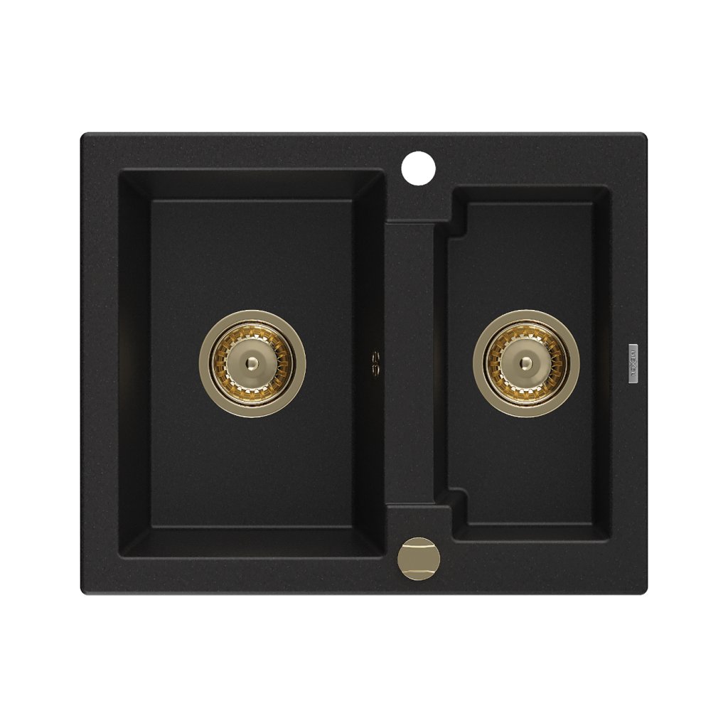 Mexen Carlos, granitový drez 582x475x177 mm, 1,5-komorový, čierna so zlatým sifónom, 6518581500-77-G