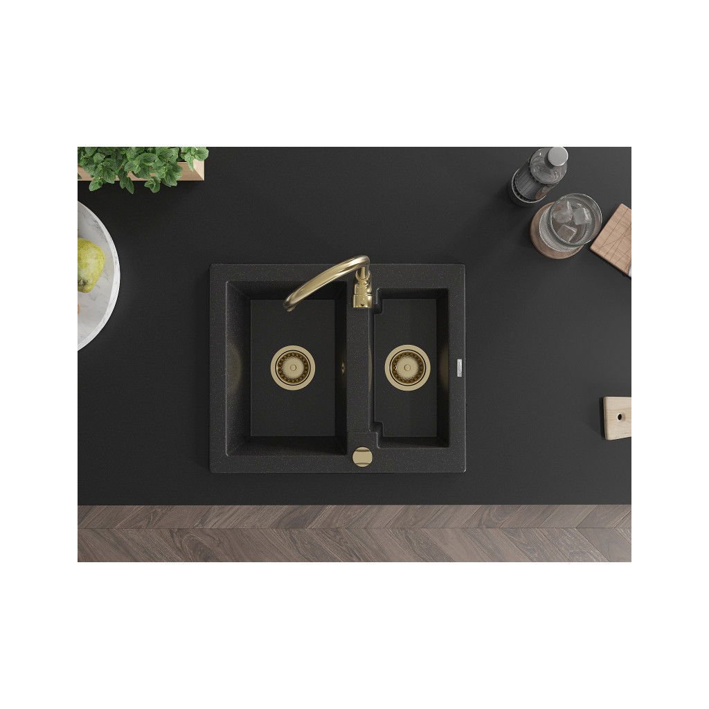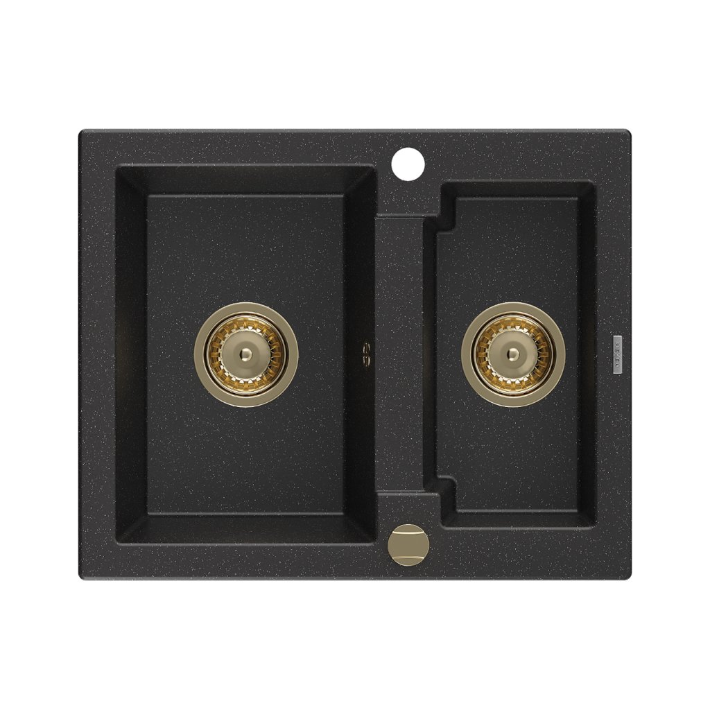 Mexen Carlos, granitový drez 582x475x177 mm, 1,5-komorový, čierna-strieborná metalíza so zlatým sifónom, 6518581500-73-G