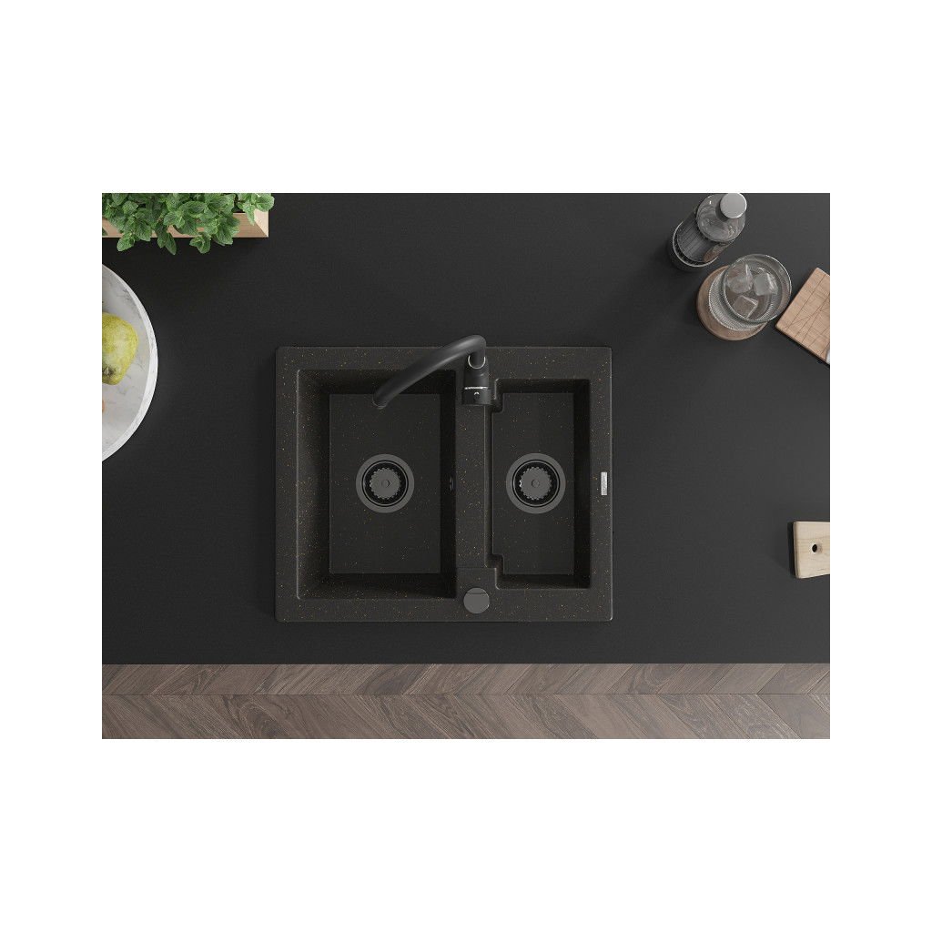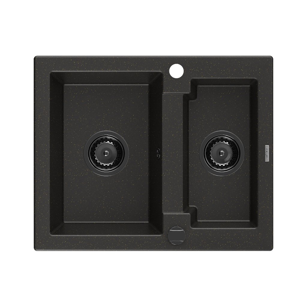 Mexen Carlos, granitový drez 582x475x177 mm, 1,5-komorový, čierna-zlatá metalíza s čiernym sifónom, 6518581500-75-B