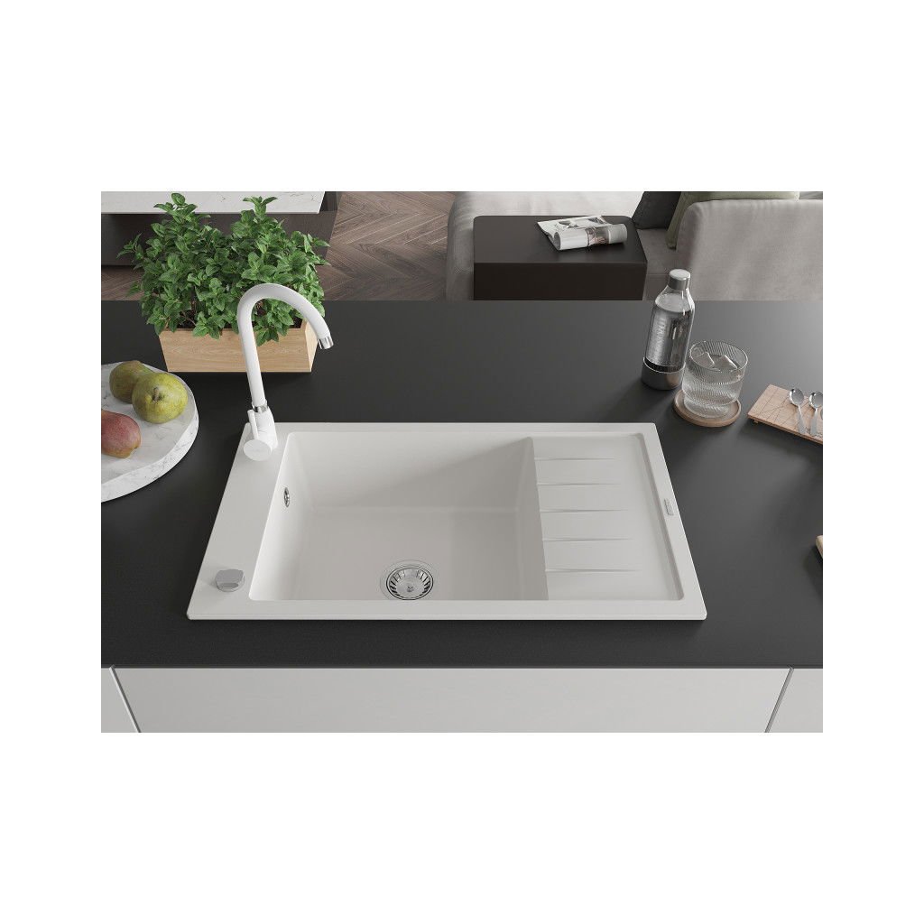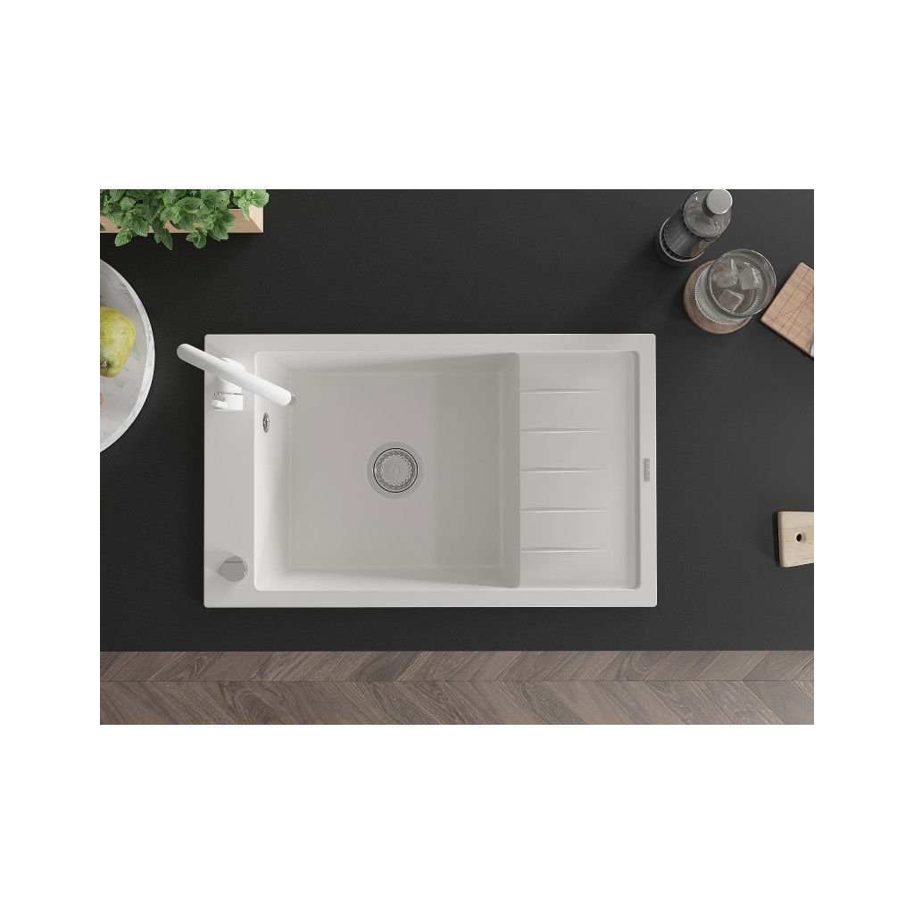 Mexen Elias, 1-komorový granitový drez s odkvapkávačom 80x48 cm a kuchynskou batériou Telma, biela, 6511-20-670200-20