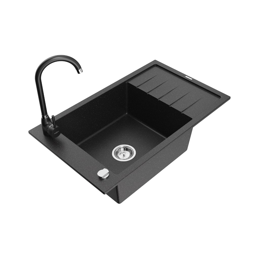 Mexen Elias, 1-komorový granitový drez s odkvapkávačom 80x48 cm a kuchynskou batériou Telma, čierna-strieborná, 6511-73-670200-70