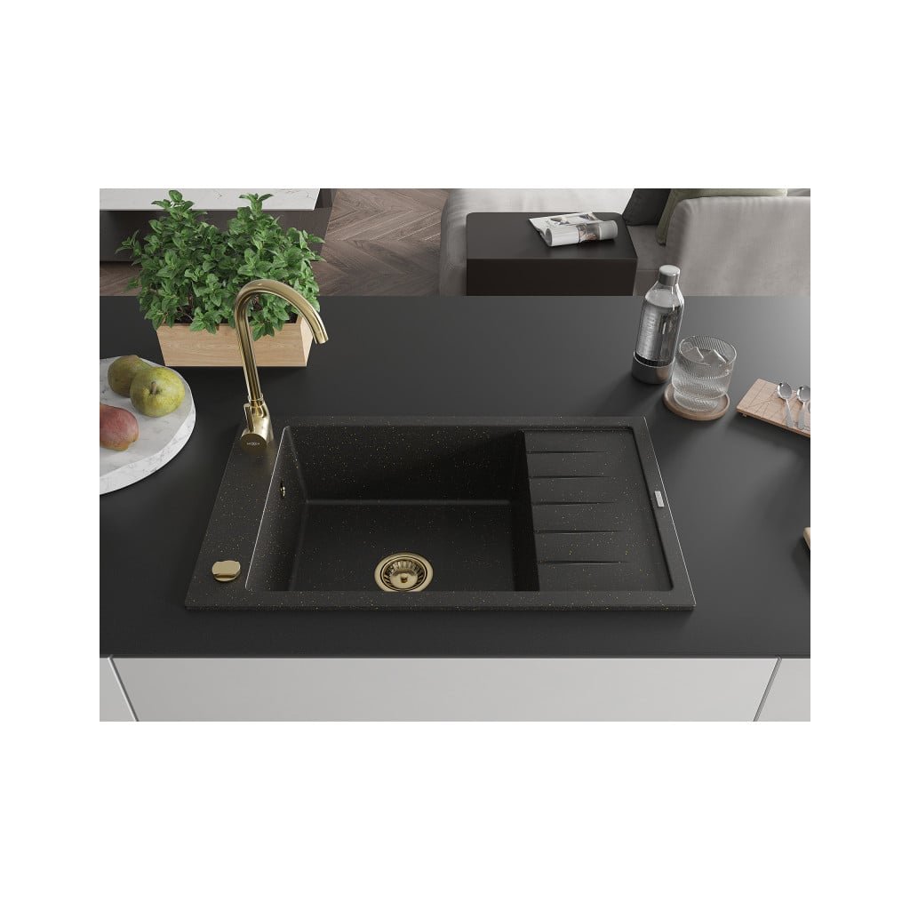 Mexen Elias, 1-komorový granitový drez s odkvapkávačom 80x48 cm a kuchynskou batériou Telma, čierna-zlatá, 6511-75-670200-50