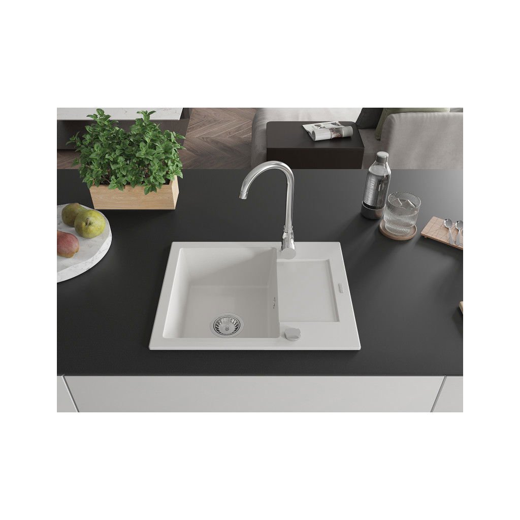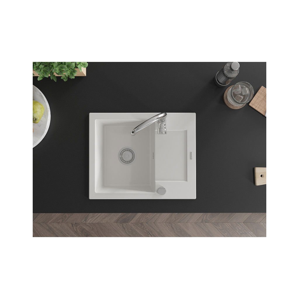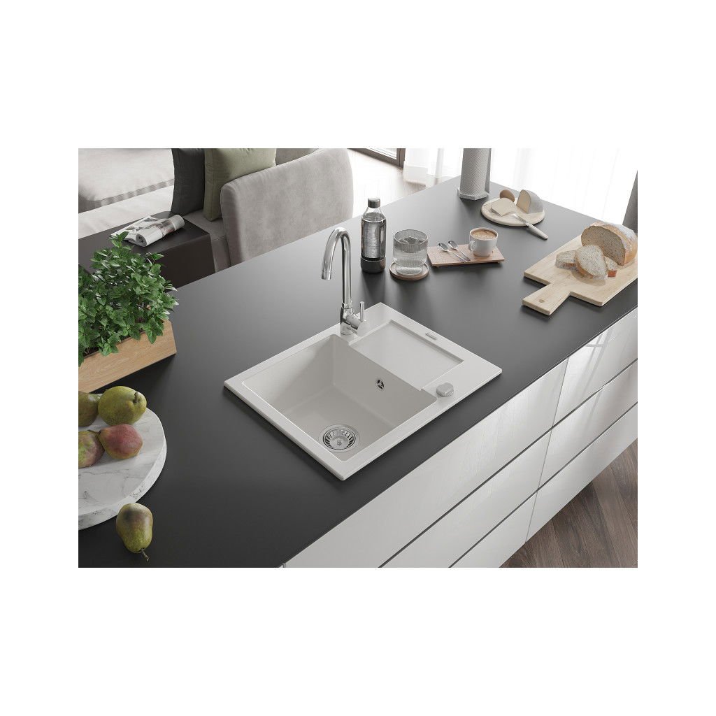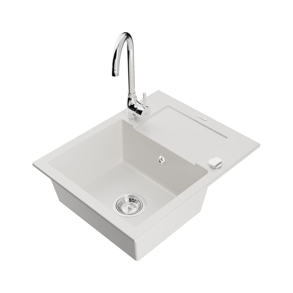 Mexen Enzo, 1-komorový granitový drez s odkvapkávačom 58x47 cm a kuchynskou batériou Telma, biela, 6506-20-670200-00