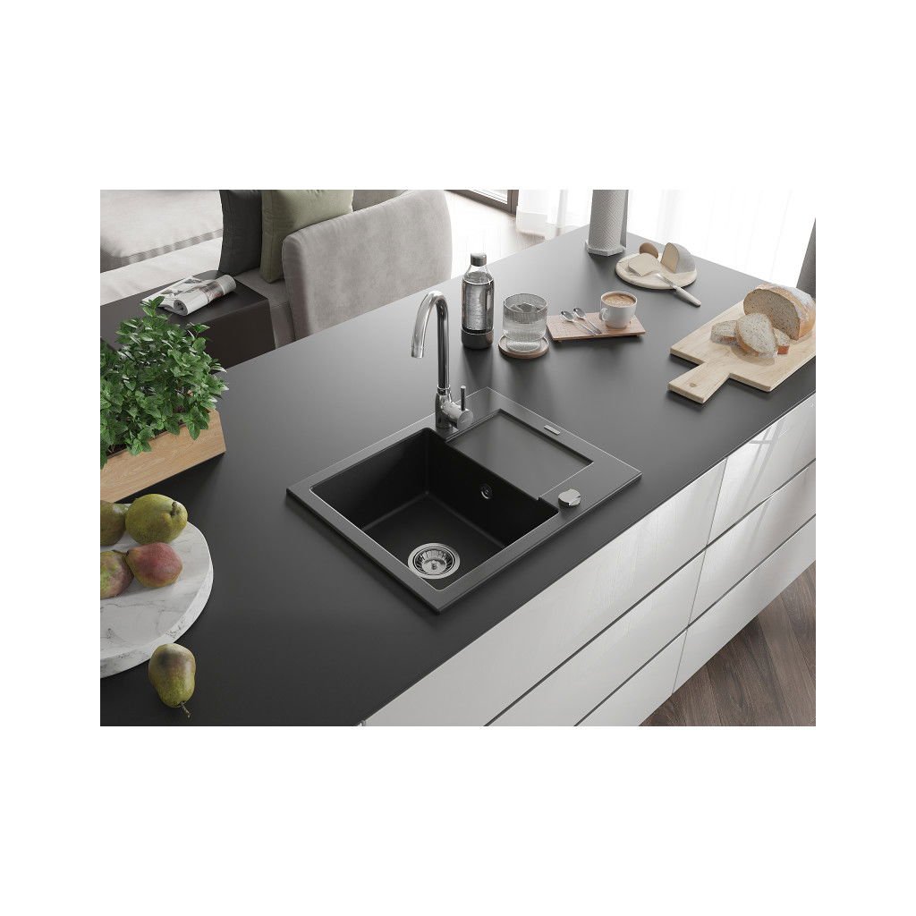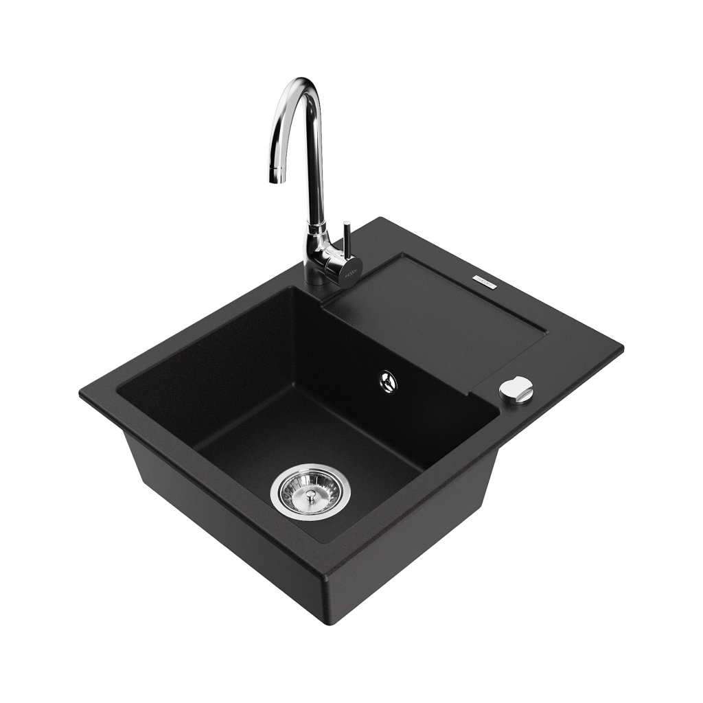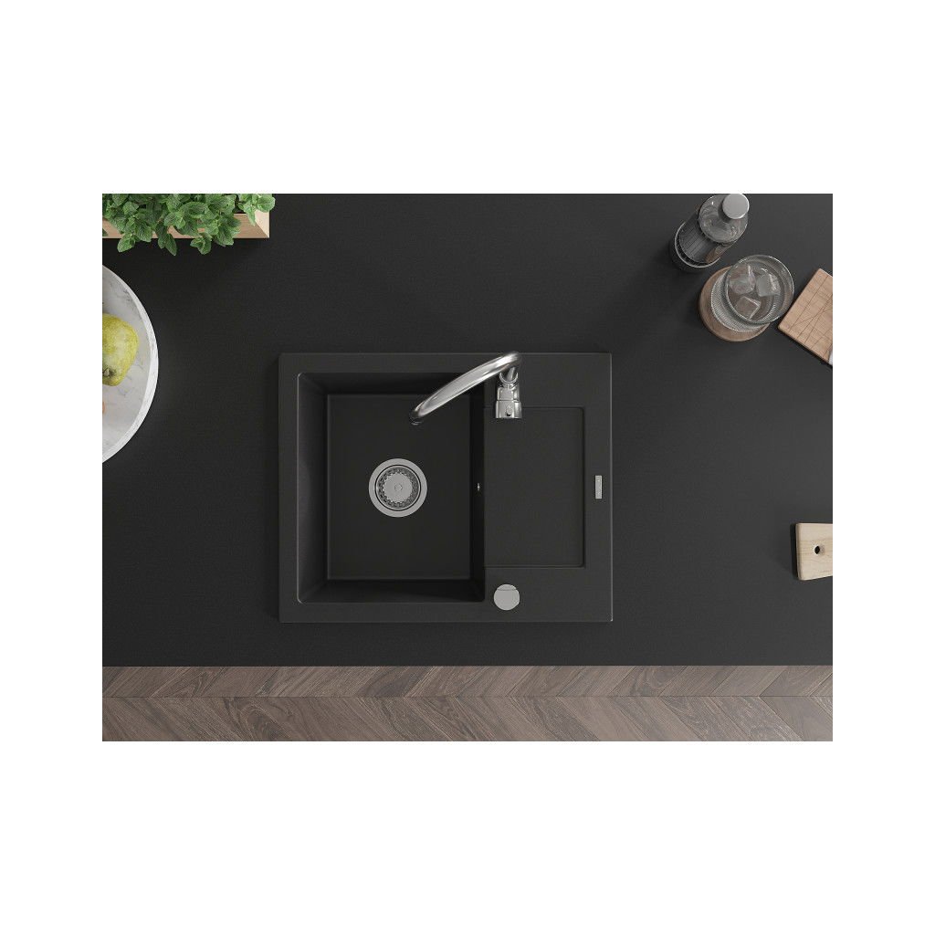 Mexen Enzo, 1-komorový granitový drez s odkvapkávačom 58x47 cm a kuchynskou batériou Telma, čierna, 6506-77-670200-00