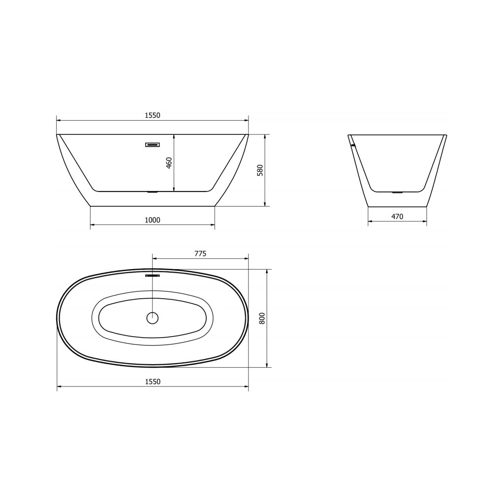 Mexen Eris, voľne stojaca vaňa 155 x 80 cm, biela-čierna, brúsená oceľ prepad, 53441558075-97