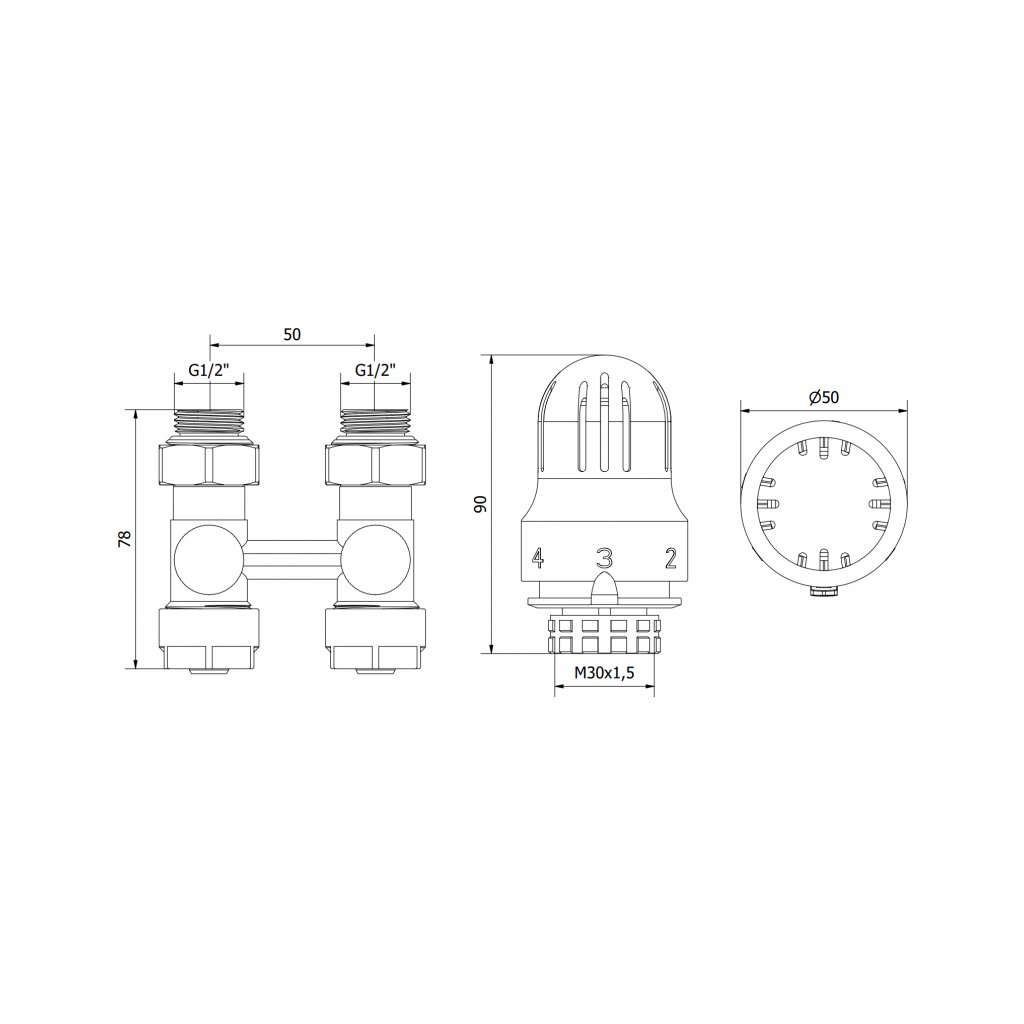 Mexen G04, termostatická sada DN50, uhlová 1/2"x16 mm a termostatická hlavica M30x1,5 mm, oceľová, W912-016-948-01