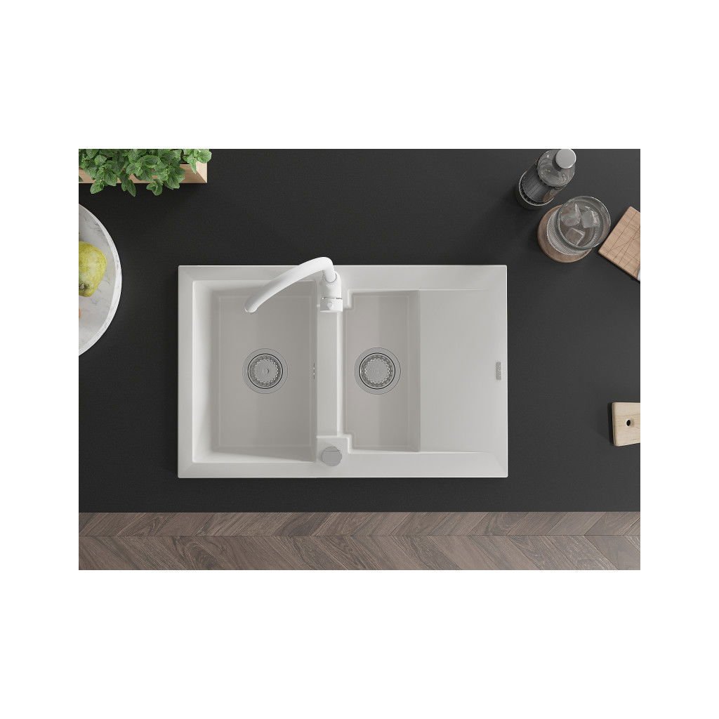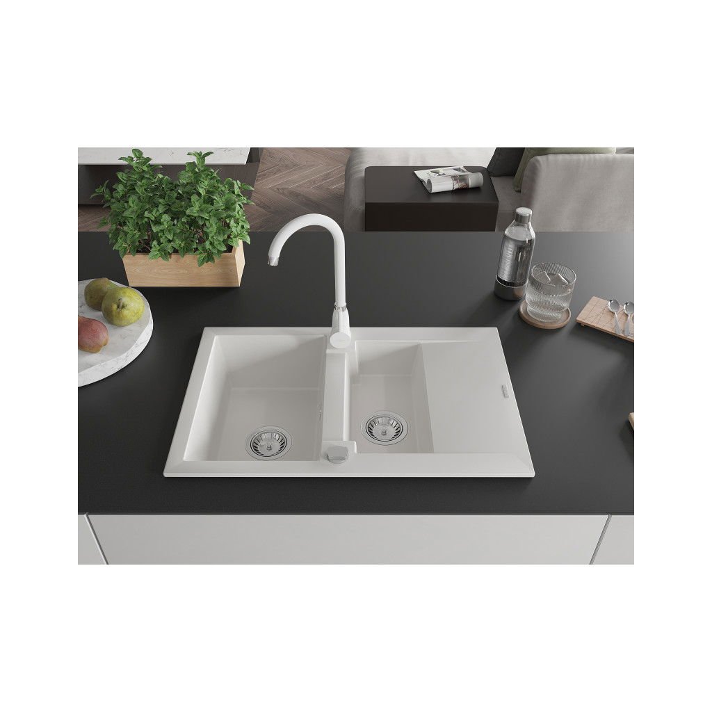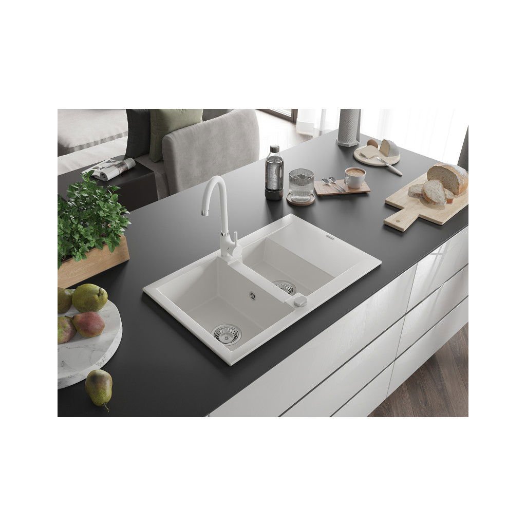 Mexen Gaspar, 1,5-komorový granitový drez s odkvapkávačom 74x48 cm a kuchynskou batériou Telma, biela, 6507-20-670200-20