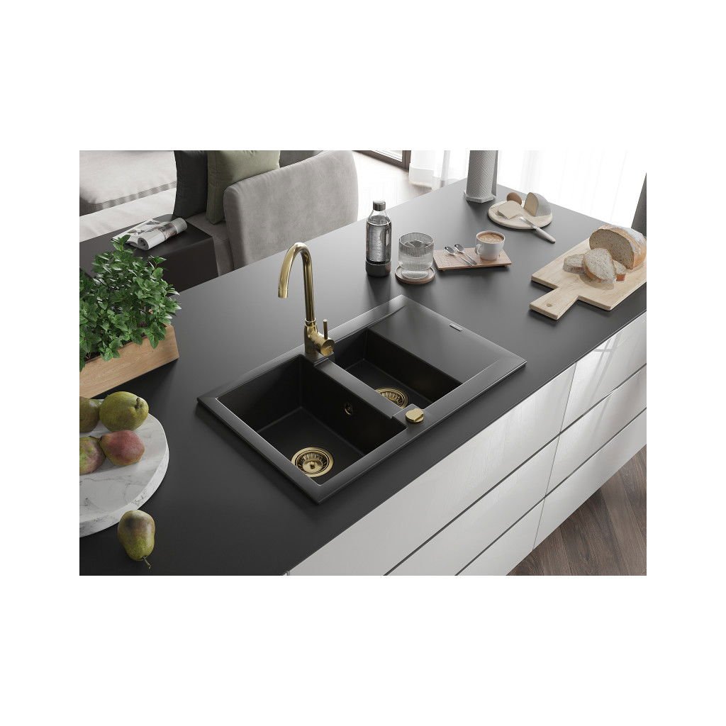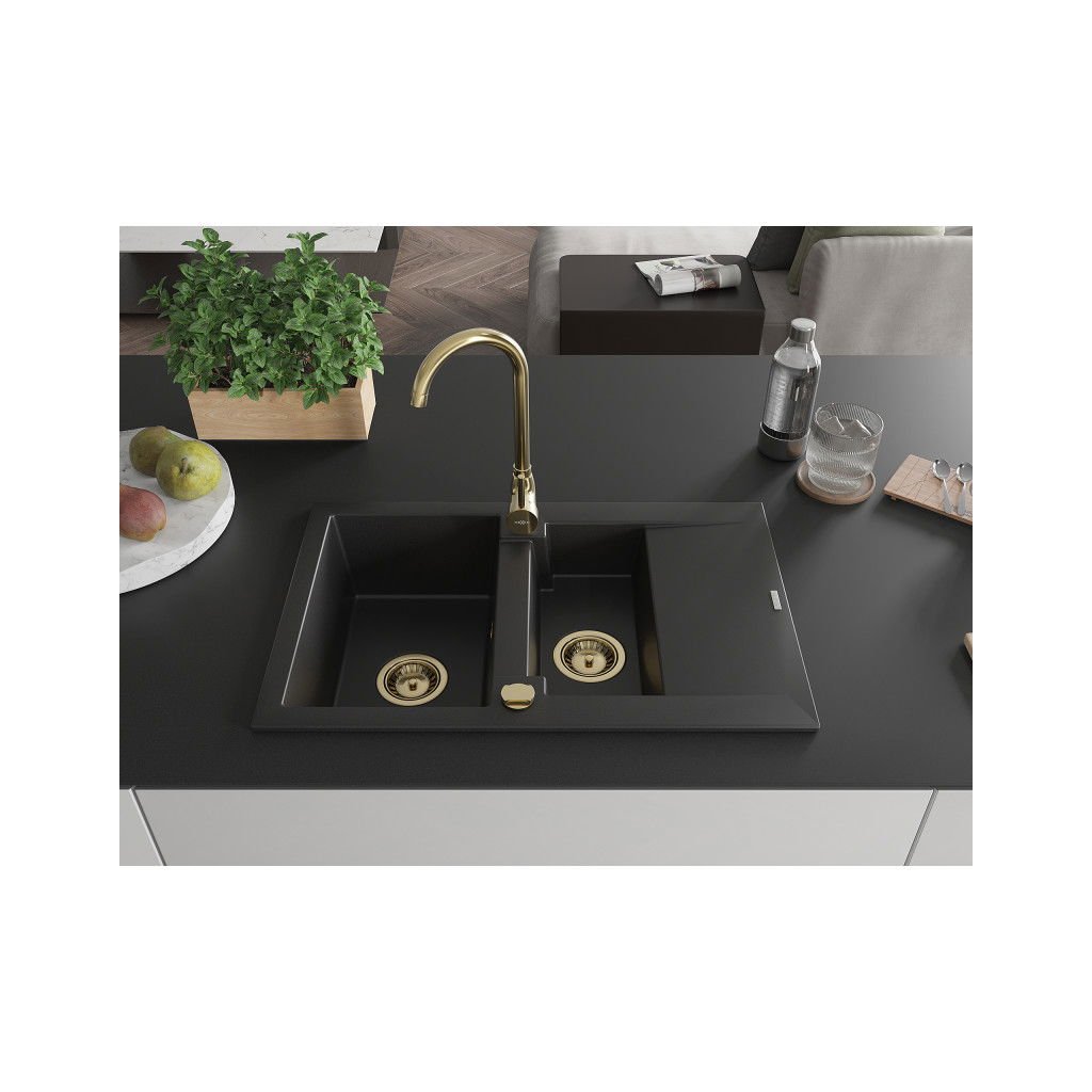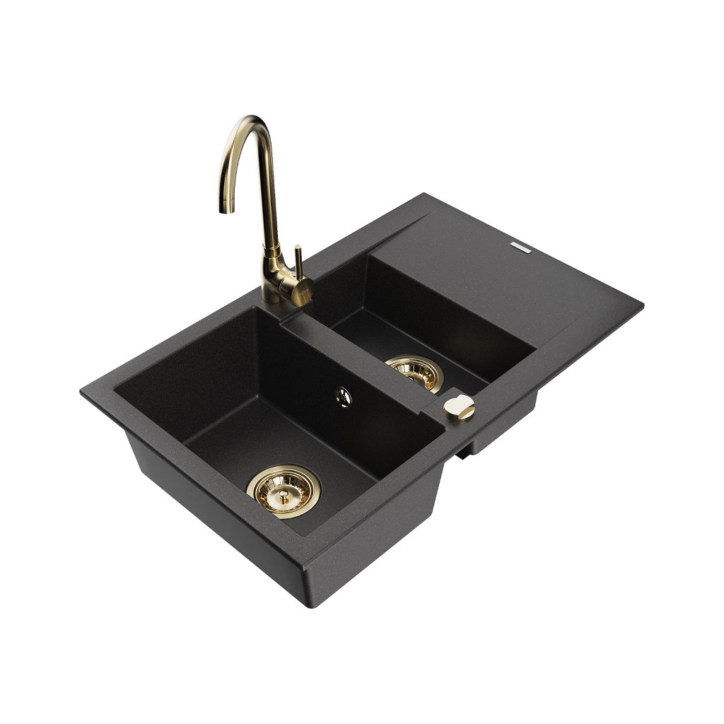 Mexen Gaspar, 1,5-komorový granitový drez s odkvapkávačom 74x48 cm a kuchynskou batériou Telma, čierna, 6507-77-670200-50
