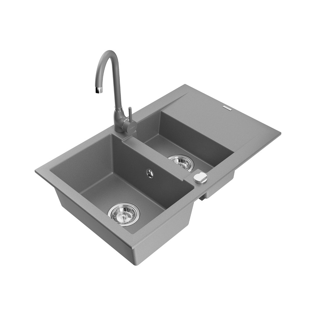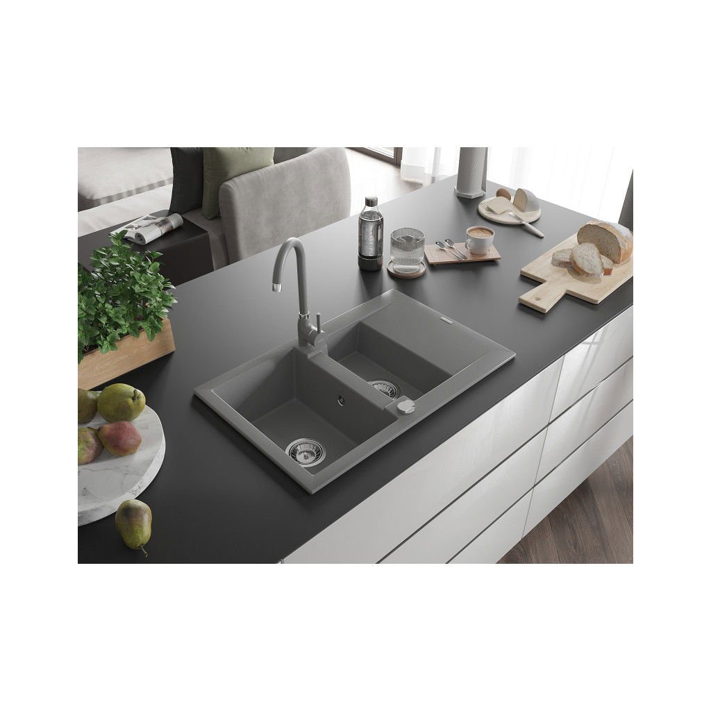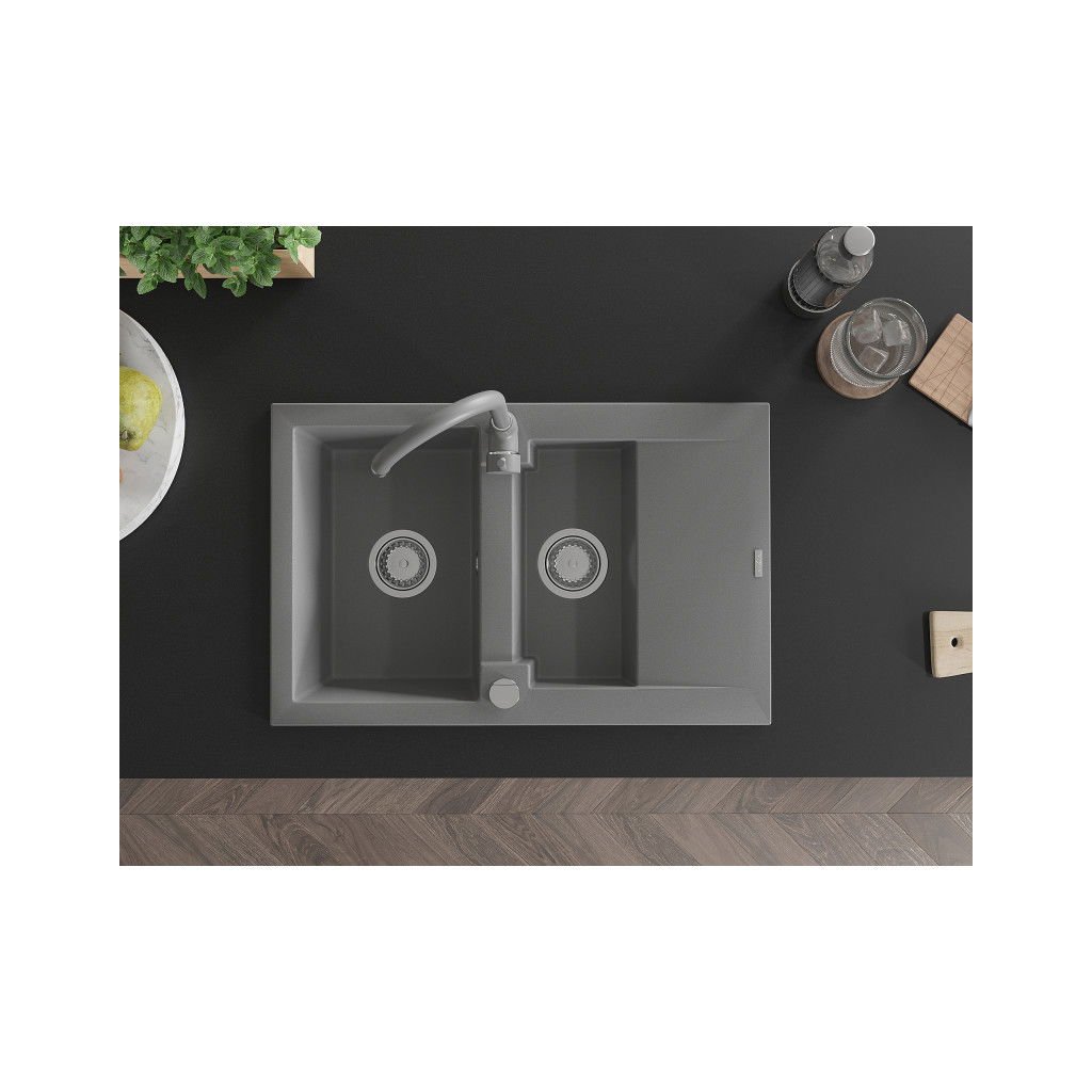 Mexen Gaspar, 1,5-komorový granitový drez s odkvapkávačom 74x48 cm a kuchynskou batériou Telma, šedá, 6507-71-670200-71