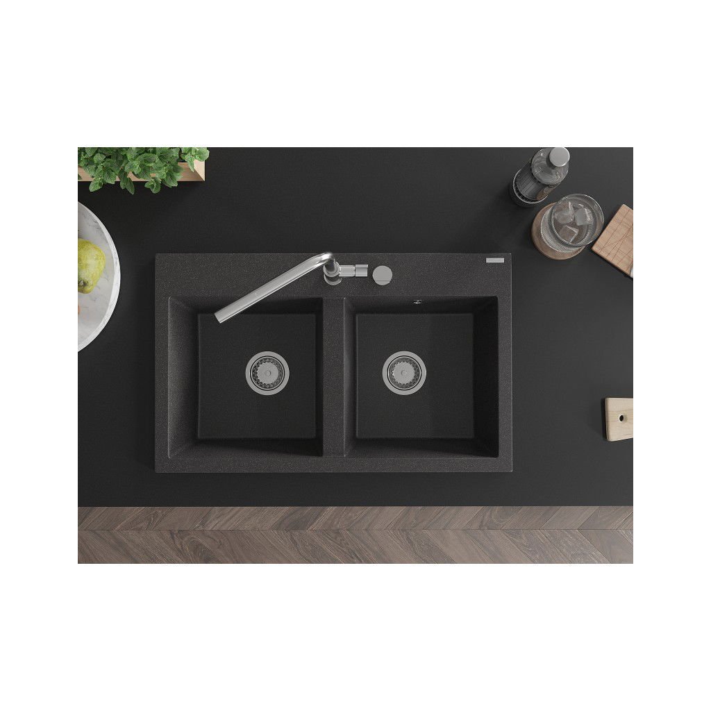 Mexen Hektor, 2-komorový granitový drez 800x480x205 mm, čierna škvrnitá, chrómový sifón, 6521802000-76