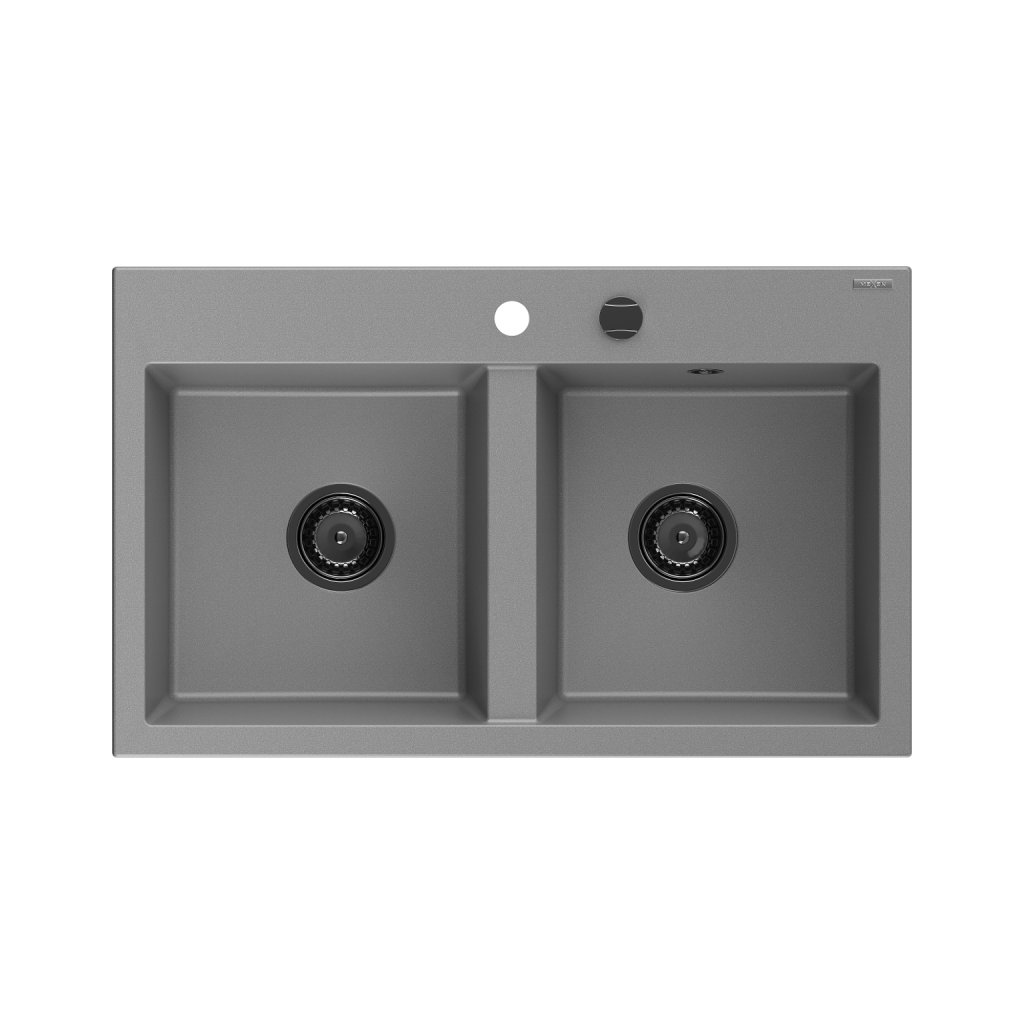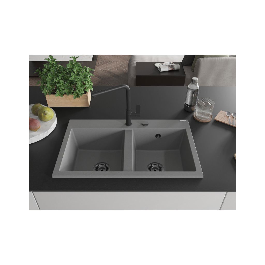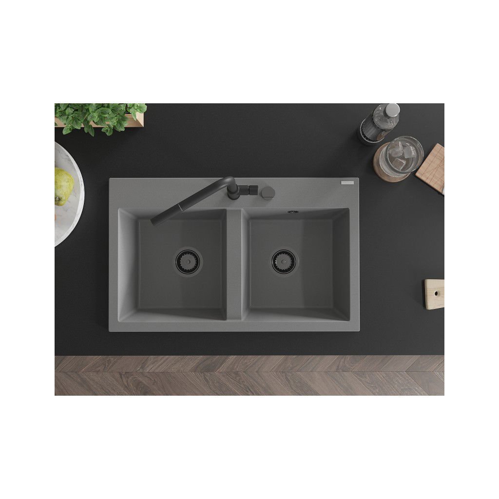Mexen Hektor, 2-komorový granitový drez 800x480x205 mm, šedá, grafitový sifón, 6521802000-71-B