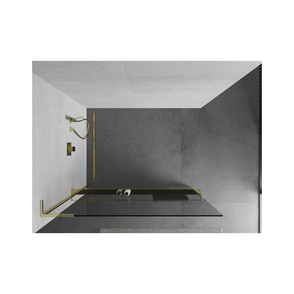 Mexen Kioto+ L, sprchová zástena Walk-In s poličkou a vešiakom 100 x 200 cm, 8mm číre sklo, zlatý lesklý profil,800-100-123-50-00