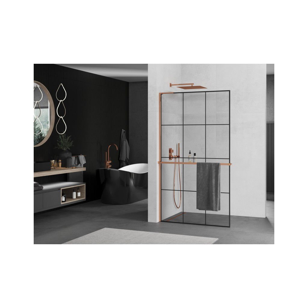 Mexen Kioto+ L, sprchová zástena Walk-In s poličkou a vešiakom 100 x 200 cm, 8mm číre sklo čierny vzor, ružové zlato profil, 800-100-123-60-77