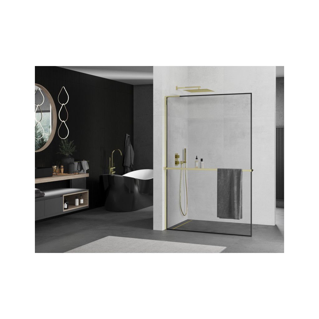 Mexen Kioto+ L, sprchová zástena Walk-In s poličkou a vešiakom 100 x 200 cm, 8mm číre sklo čierny vzor, zlatý lesklý profil,800-100-123-50-70