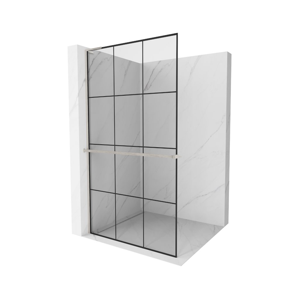 Mexen Kioto+ L, sprchová zástena Walk-In s poličkou a vešiakom 110 x 200 cm, 8mm číre sklo čierny vzor, brúsená oceľ profil, 800-110-123-97-77